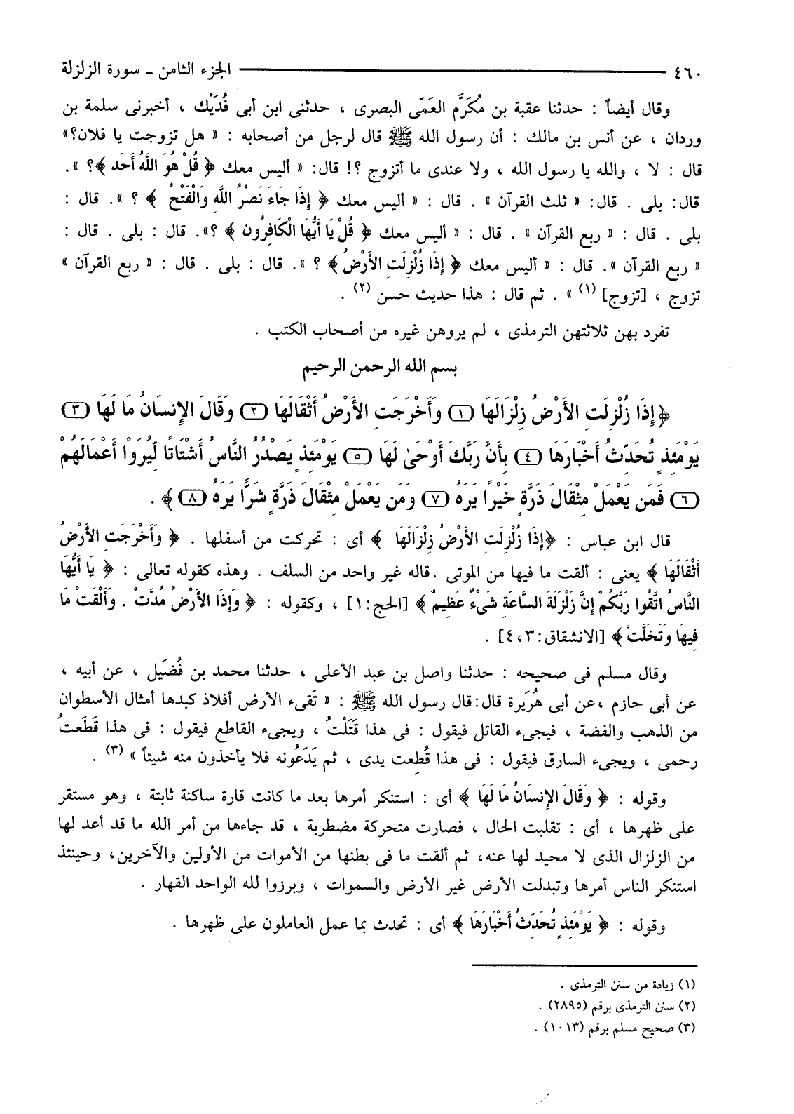 {إِذَا زُلْزِلَتِ الأرْضُ زِلْزَالَهَا (1) وَأَخْرَجَتِ الأرْضُ أَثْقَالَهَا (2) وَقَالَ الإنْسَانُ مَا لَهَا (3) يَوْمَئِذٍ تُحَدِّثُ أَخْبَارَهَا (4) بِأَنَّ رَبَّكَ أَوْحَى لَهَا (5) يَوْمَئِذٍ يَصْدُرُ النَّاسُ أَشْتَاتًا لِيُرَوْا أَعْمَالَهُمْ (6) فَمَنْ يَعْمَلْ مِثْقَالَ ذَرَّةٍ خَيْرًا يَرَهُ (7) وَمَنْ يَعْمَلْ مِثْقَالَ ذَرَّةٍ شَرًّا يَرَهُ (8) }