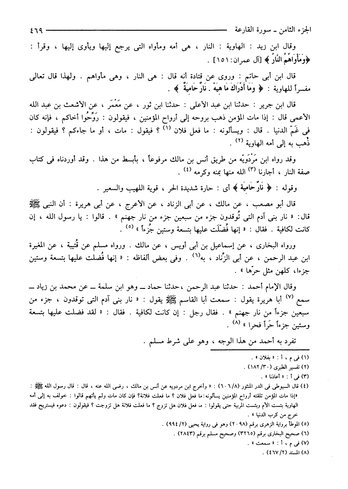 (4) قال السيوطي في الدر المنثور (8/606) : "وأخرج ابن مردويه عَنْ أَنَسِ بْنِ مَالِكٍ، رَضِيَ اللَّهُ عَنْهُ، قَالَ: قَالَ رَسُولُ اللَّهِ صَلَّى اللَّهُ عَلَيْهِ وَسَلَّمَ: "إذا مات المؤمن تلقته أرواح المؤمنين يسألونه: ما فعل فلان؟ ما فعلت فلانة؟ فإن كان مات ولم يأتهم قالوا: خولف به إلى أمه الهاوية بئست الأم وبئست المربية حتى يقولوا: ما فعل فلان هل تزوج؟ ما فعلت فلانة هل تزوجت؟ فيقولون: دعوه فيستريح فقد خرج من كرب الدنيا".