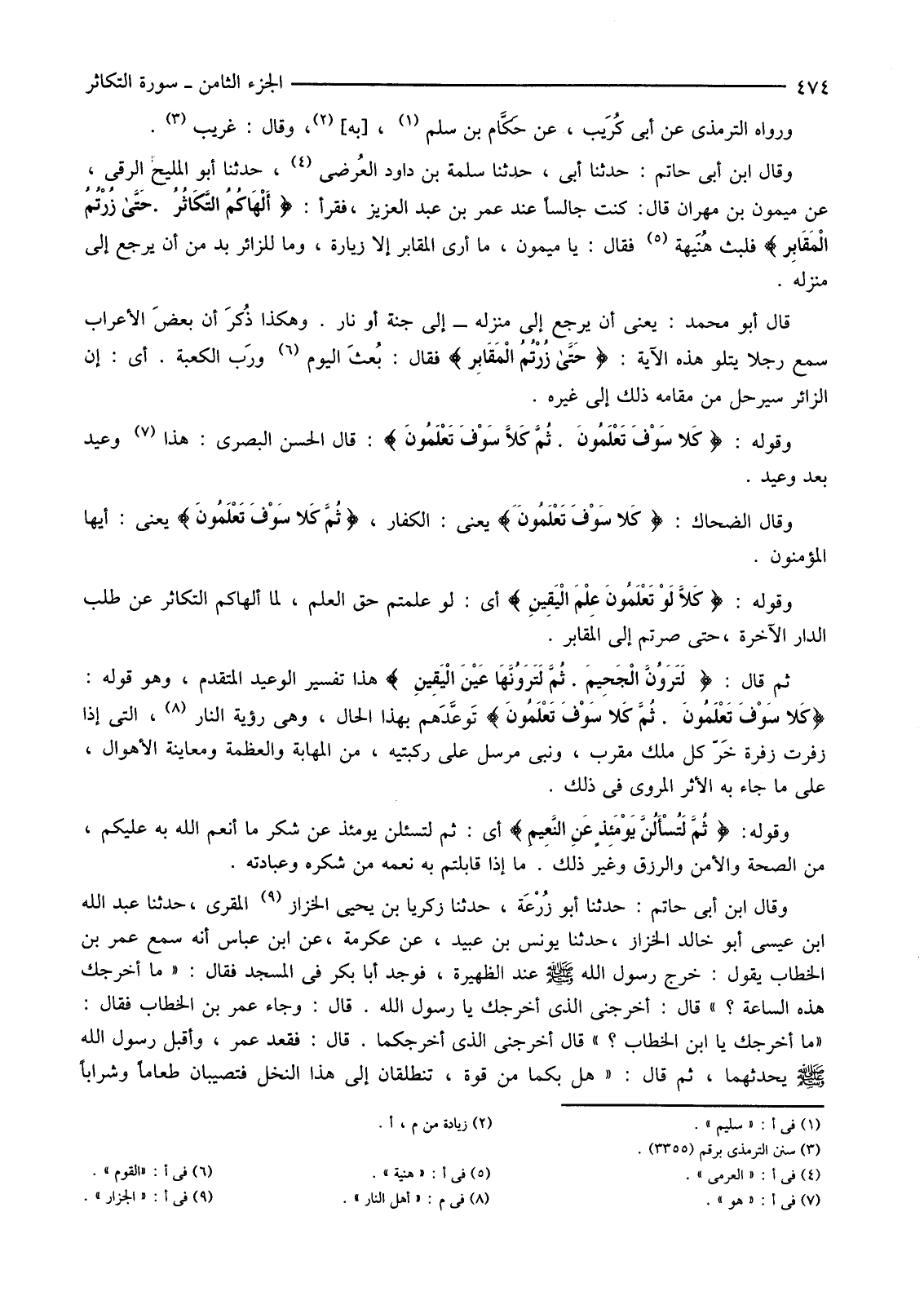 وَقَالَ ابْنُ أَبِي حَاتِمٍ: حَدَّثَنَا أَبِي، حَدَّثَنَا سَلَمَةُ بْنُ دَاوُدَ العُرضي (4) حَدَّثَنَا أَبُو الْمَلِيحِ الرَّقِّيُّ، عَنْ مَيْمُونِ بْنِ مِهْرَانَ قَالَ: كُنْتُ جَالِسًا عِنْدَ عُمَرَ بْنِ عَبْدِ الْعَزِيزِ، فَقَرَأَ: {أَلْهَاكُمُ التَّكَاثُرُ حَتَّى زُرْتُمُ الْمَقَابِرَ} فَلَبِثَ هُنَيْهَةً (5) فَقَالَ: يَا مَيْمُونُ، مَا أَرَى الْمَقَابِرَ إِلَّا زِيَارَةً، وَمَا لِلزَّائِرِ بُدٌّ مِنْ أَنْ يَرْجِعَ إِلَى مَنْزِلِهِ.