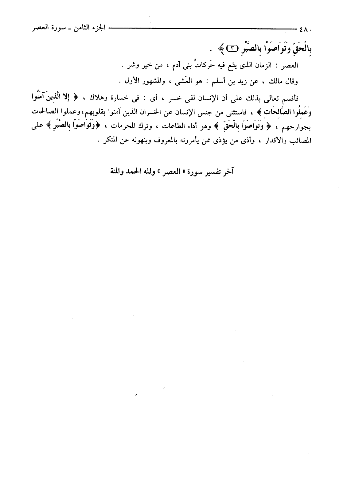 فَأَقْسَمَ تَعَالَى بِذَلِكَ عَلَى أَنَّ الْإِنْسَانَ لَفِي خُسْرٍ، أَيْ: فِي خَسَارَةٍ وَهَلَاكٍ، {إِلا الَّذِينَ آمَنُوا وَعَمِلُوا الصَّالِحَاتِ} فَاسْتَثْنَى مِنْ جِنْسِ الْإِنْسَانِ عَنِ الْخُسْرَانِ الَّذِينَ آمَنُوا بِقُلُوبِهِمْ، وَعَمِلُوا الصَّالِحَاتِ بِجَوَارِحِهِمْ، {وَتَوَاصَوْا بِالْحَقِّ} وَهُوَ أَدَاءُ الطَّاعَاتِ، وَتَرْكُ الْمُحَرَّمَاتِ، {وَتَوَاصَوْا بِالصَّبْرِ} عَلَى الْمَصَائِبِ وَالْأَقْدَارِ، وَأَذَى مَنْ يُؤْذِي مِمَّنْ يَأْمُرُونَهُ بِالْمَعْرُوفِ وَيَنْهَوْنَهُ عَنِ الْمُنْكَرِ. آخِرُ تَفْسِيرِ سُورَةِ "الْعَصْرِ" وَلِلَّهِ الْحَمْدُ وَالْمِنَّةُ