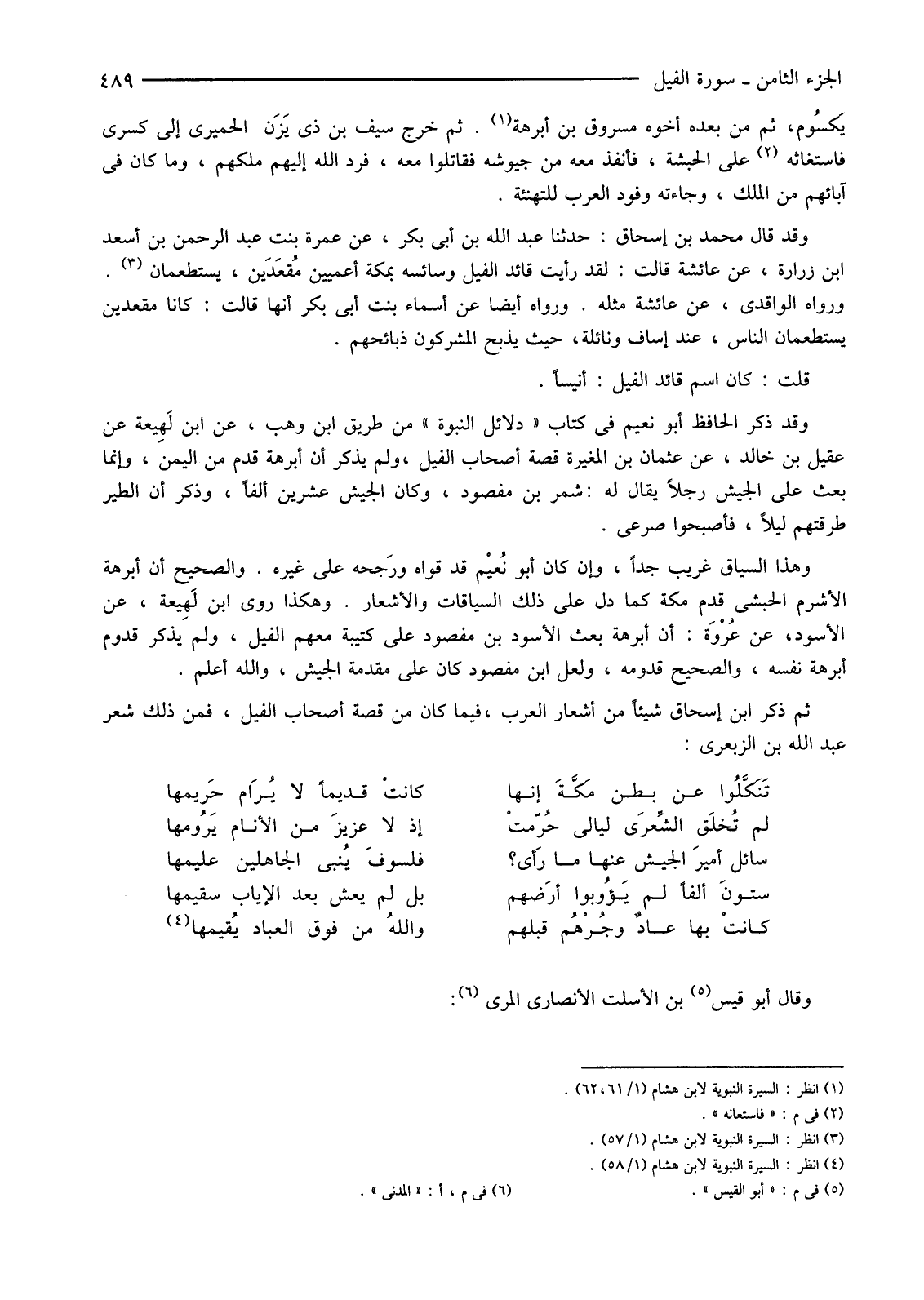 ثُمَّ ذَكَرَ ابْنُ إِسْحَاقَ شَيْئًا مِنْ أَشْعَارِ الْعَرَبِ، فِيمَا كَانَ مِنْ قِصَّةِ أَصْحَابِ الْفِيلِ، فَمِنْ ذَلِكَ شِعْرُ عَبْدِ اللَّهِ بْنِ الزَّبْعَرِيِّ: