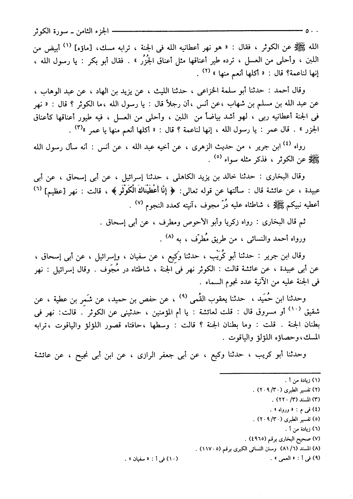 رَوَاهُ (4) ابْنُ جَرِيرٍ، مِنْ حَدِيثِ الزُّهْرِيِّ، عَنْ أَخِيهِ عَبْدِ اللَّهِ، عَنْ أَنَسٍ: أَنَّهُ سَأَلَ رَسُولَ اللَّهِ صَلَّى اللَّهُ عَلَيْهِ وَسَلَّمَ عن الْكَوْثَرِ، فَذَكَرَ مِثْلَهُ سَوَاءً. (5)