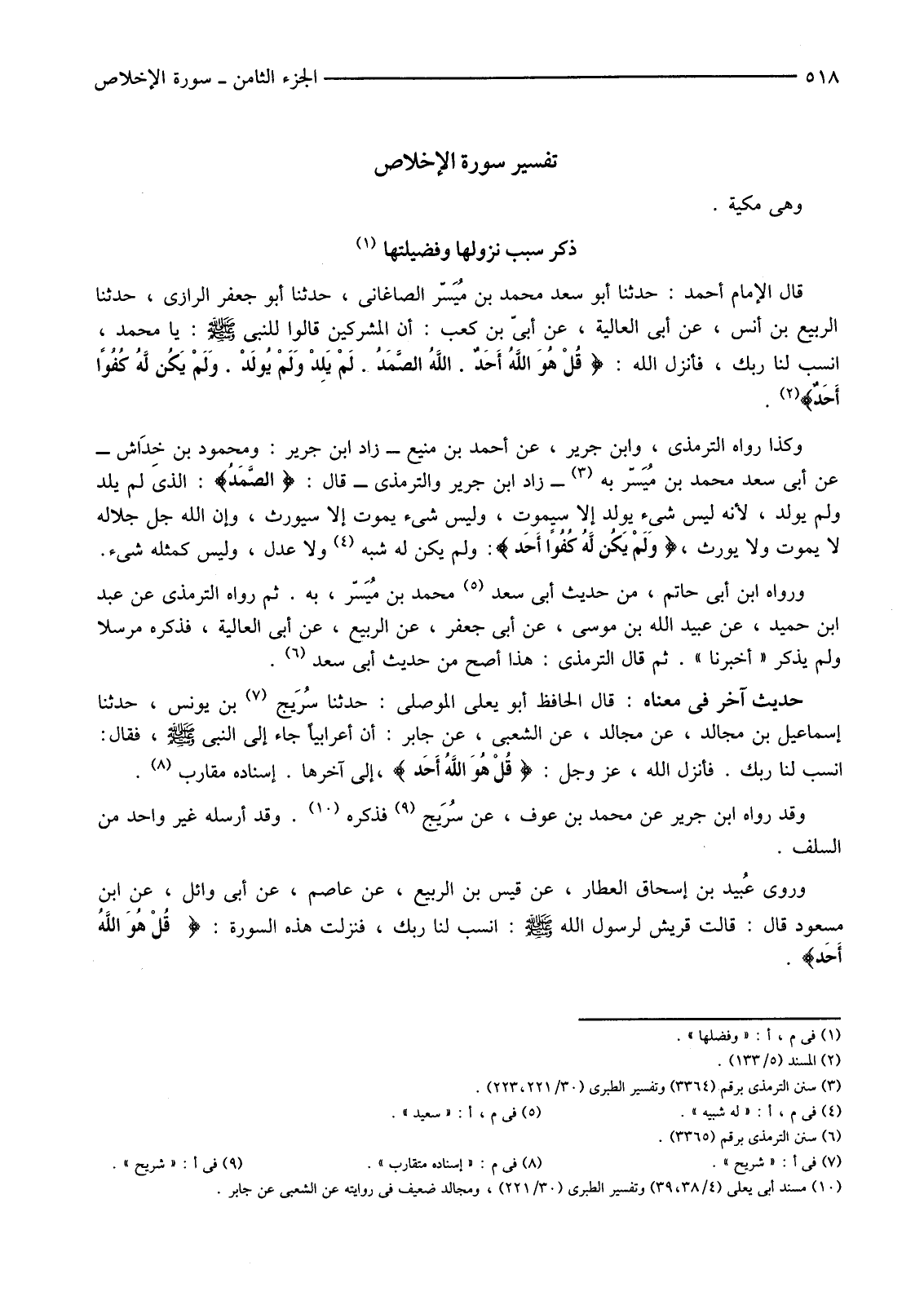 قَالَ الْإِمَامُ أَحْمَدُ: حَدَّثَنَا أَبُو سَعْدٍ مُحَمَّدُ بْنُ مُيَسّر الصَّاغَانِيُّ، حَدَّثَنَا أَبُو جَعْفَرٍ الرَّازِيُّ، حَدَّثَنَا الرَّبِيعِ بْنِ أَنَسٍ، عَنْ أَبِي الْعَالِيَةِ، عَنْ أُبَيِّ بْنِ كَعْبٍ: أَنَّ الْمُشْرِكِينَ قَالُوا لِلنَّبِيِّ صَلَّى اللَّهُ عَلَيْهِ وَسَلَّمَ: يَا مُحَمَّدُ، انْسُبْ لَنَا رَبَّكَ، فَأَنْزَلَ اللَّهُ: " قُلْ هُوَ اللَّهُ أَحَدٌ اللَّهُ الصَّمَدُ لَمْ يَلِدْ وَلَمْ يُو لَدْ وَلَمْ يَكُنْ لَهُ كُفُوًا أَحَدٌ " (2) .