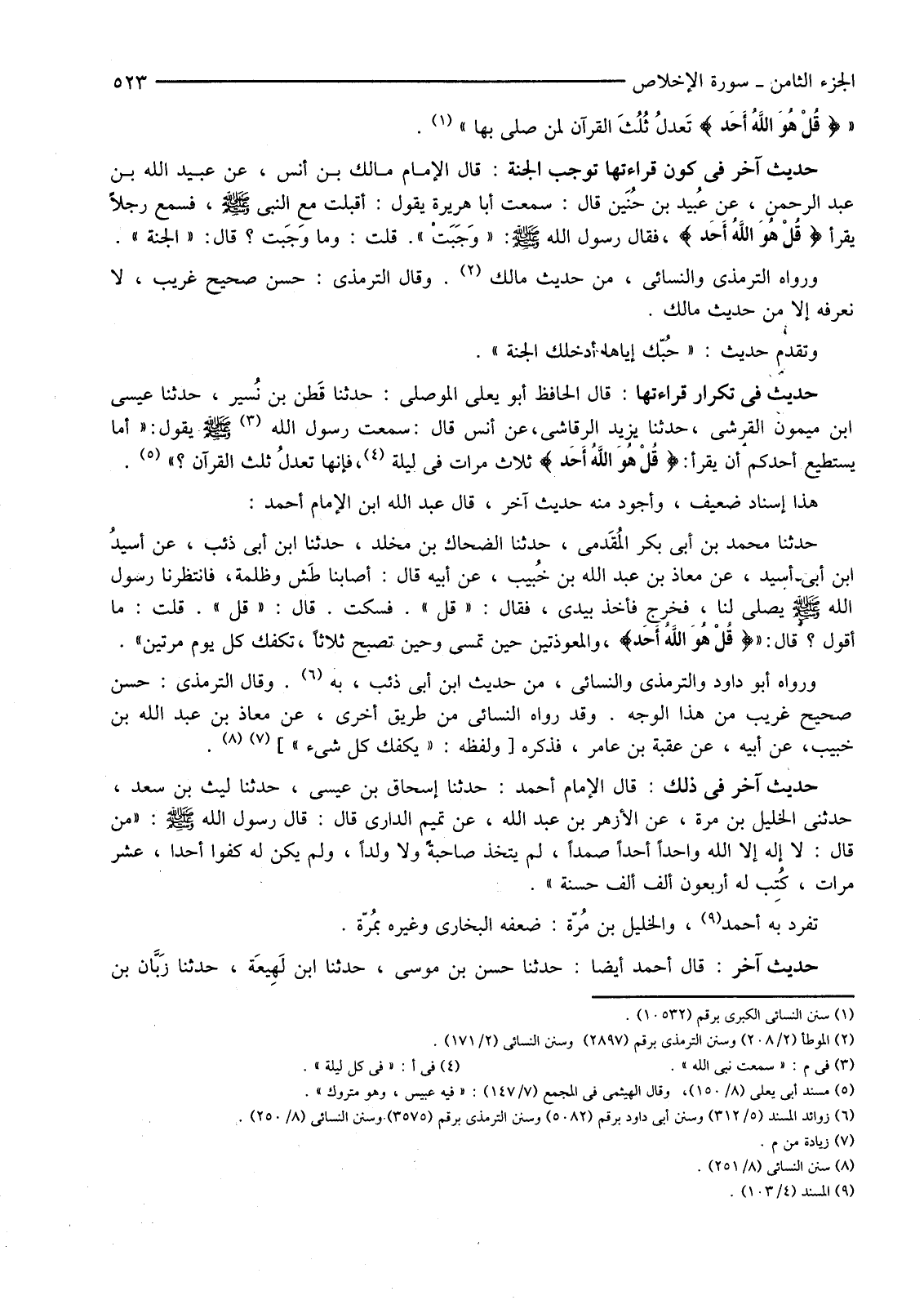 حَدِيثٌ فِي تَكْرَارِ قِرَاءَتِهَا: قَالَ الْحَافِظُ أَبُو يَعْلَى الْمُوصِلِيُّ: حَدَّثَنَا قَطن بن نُسير، حدثنا عيسى ابن مَيْمُونٍ الْقُرَشِيُّ، حَدَّثَنَا يَزِيدُ الرَّقَاشِيُّ، عَنْ أَنَسٍ قَالَ: سَمِعْتُ رَسُولَ اللَّهِ (3) صَلَّى اللَّهُ عَلَيْهِ وَسَلَّمَ يَقُولُ: "أَمَا يَسْتَطِيعُ أَحَدُكُمْ أَنْ يَقْرَأَ: " قُلْ هُوَ اللَّهُ أَحَدٌ " ثَلَاثَ مَرَّاتٍ فِي لَيْلَةٍ (4) فَإِنَّهَا تعدلُ ثُلْثَ الْقُرْآنِ؟ " (5)