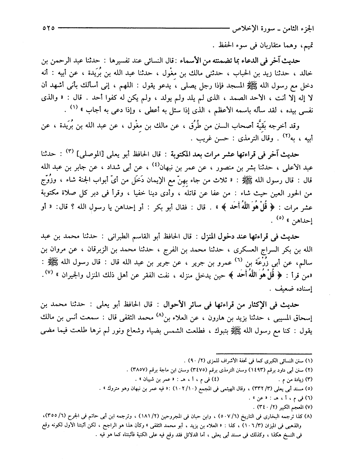 حَدِيثٌ فِي الْإِكْثَارِ مِنْ قِرَاءَتِهَا فِي سَائِرِ الْأَحْوَالِ: قَالَ الْحَافِظُ أَبُو يَعْلَى: حَدَّثَنَا مُحَمَّدُ بْنُ إِسْحَاقَ الْمُسَيَّبِيُّ، حَدَّثَنَا يَزِيدُ بْنُ هَارُونَ، عَنِ الْعَلَاءِ بْنِ (8) مُحَمَّدٍ الثَّقَفِيِّ قَالَ: سَمِعْتُ أَنَسَ بْنَ مَالِكٍ يَقُولُ: كُنَّا مَعَ رَسُولِ اللَّهِ صَلَّى اللَّهُ عَلَيْهِ وَسَلَّمَ بِتَبُوكَ، فَطَلَعَتِ الشَّمْسُ بِضِيَاءٍ وَشُعَاعٍ وَنُورٍ لَمْ نرها طلعت فيما مضى