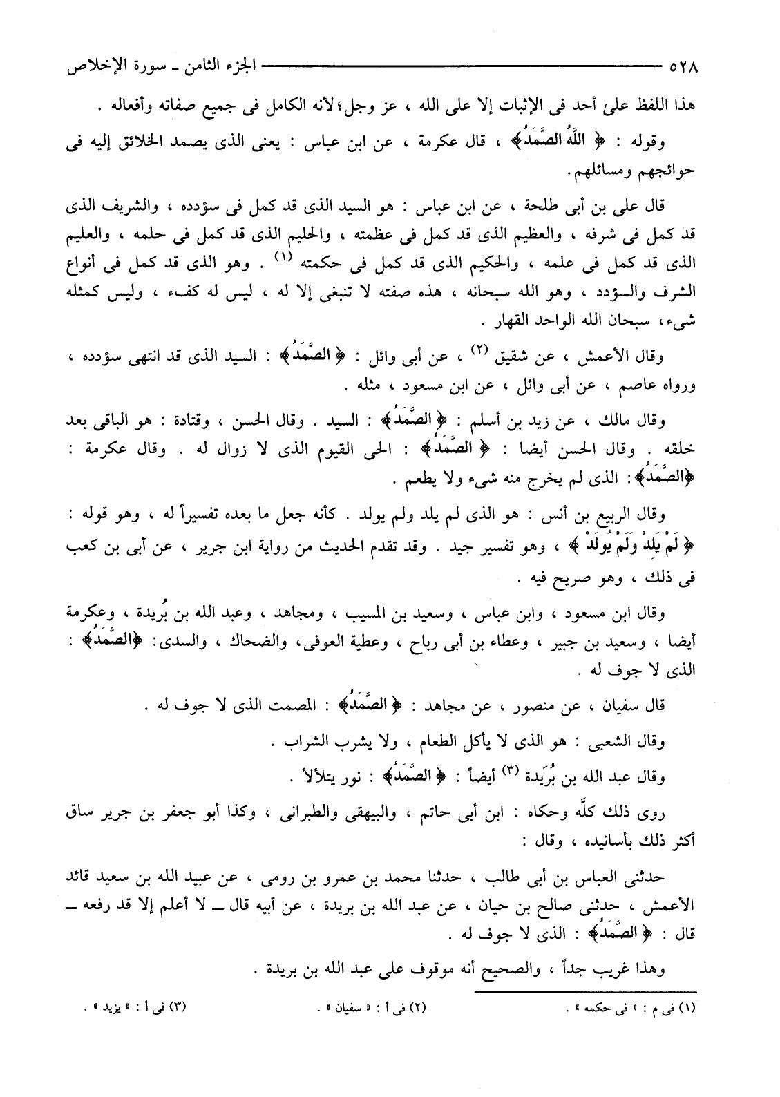 قَالَ عَلِيُّ بْنُ أَبِي طَلْحَةَ، عَنِ ابْنِ عَبَّاسٍ: هُوَ السَّيِّدُ الَّذِي قَدْ كَمُلَ فِي سُؤْدُدِهِ، وَالشَّرِيفُ الَّذِي قَدْ كَمُلَ فِي شَرَفِهِ، وَالْعَظِيمُ الَّذِي قَدْ كَمُلَ فِي عَظْمَتِهِ، وَالْحَلِيمُ الَّذِي قَدْ كَمُلَ فِي حِلْمِهِ، وَالْعَلِيمُ الَّذِي قَدْ كَمُلَ فِي عِلْمِهِ، وَالْحَكِيمُ الَّذِي قَدْ كَمُلَ فِي حِكْمَتِهِ (1) وَهُوَ الَّذِي قَدْ كَمُلَ فِي أَنْوَاعِ الشَّرَفِ وَالسُّؤْدُدِ، وَهُوَ اللَّهُ سُبْحَانَهُ، هَذِهِ صِفَتُهُ لَا تَنْبَغِي إِلَّا لَهُ، لَيْسَ لَهُ كُفْءٌ، وليس كمثله شيء، سبحان الله الواحد القهار.