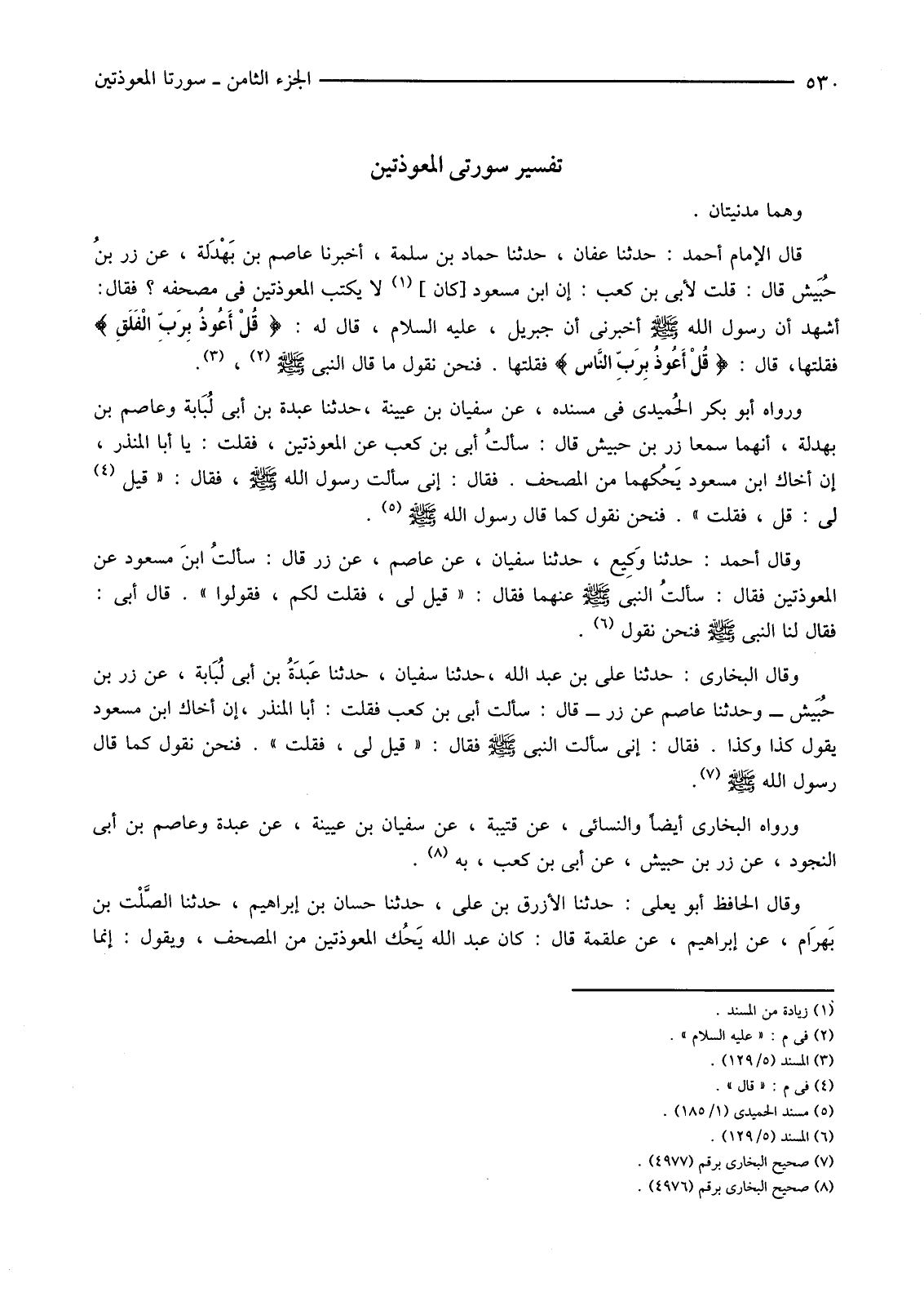 قَالَ الْإِمَامُ أَحْمَدُ: حَدَّثَنَا عَفَّانُ، حَدَّثَنَا حَمَّادُ بْنُ سَلَمَةَ، أَخْبَرَنَا عَاصِمِ بْنِ بَهْدَلة، عَنْ زِرِّ بنُ حُبَيش قَالَ: قُلْتُ لِأُبَيِّ بْنِ كَعْبٍ: إِنَّ ابْنَ مَسْعُودٍ [كَانَ] (1) لَا يَكْتُبُ الْمُعَوِّذَتَيْنِ فِي مُصْحَفِهِ؟ فَقَالَ: أَشْهَدُ أَنَّ رَسُولَ اللَّهِ صَلَّى اللَّهُ عَلَيْهِ وَسَلَّمَ أَخْبَرَنِي أَنَّ جِبْرِيلَ، عَلَيْهِ السَّلَامُ، قَالَ لَهُ: " قُلْ أَعُوذُ بِرَبِّ الْفَلَقِ " فَقُلْتُهَا، قَالَ: " قُلْ أَعُوذُ بِرَبِّ النَّاسِ " فَقُلْتُهَا. فَنَحْنُ نَقُولُ مَا قَالَ النَّبِيُّ صَلَّى اللَّهُ عَلَيْهِ وَسَلَّمَ (2) (3) .