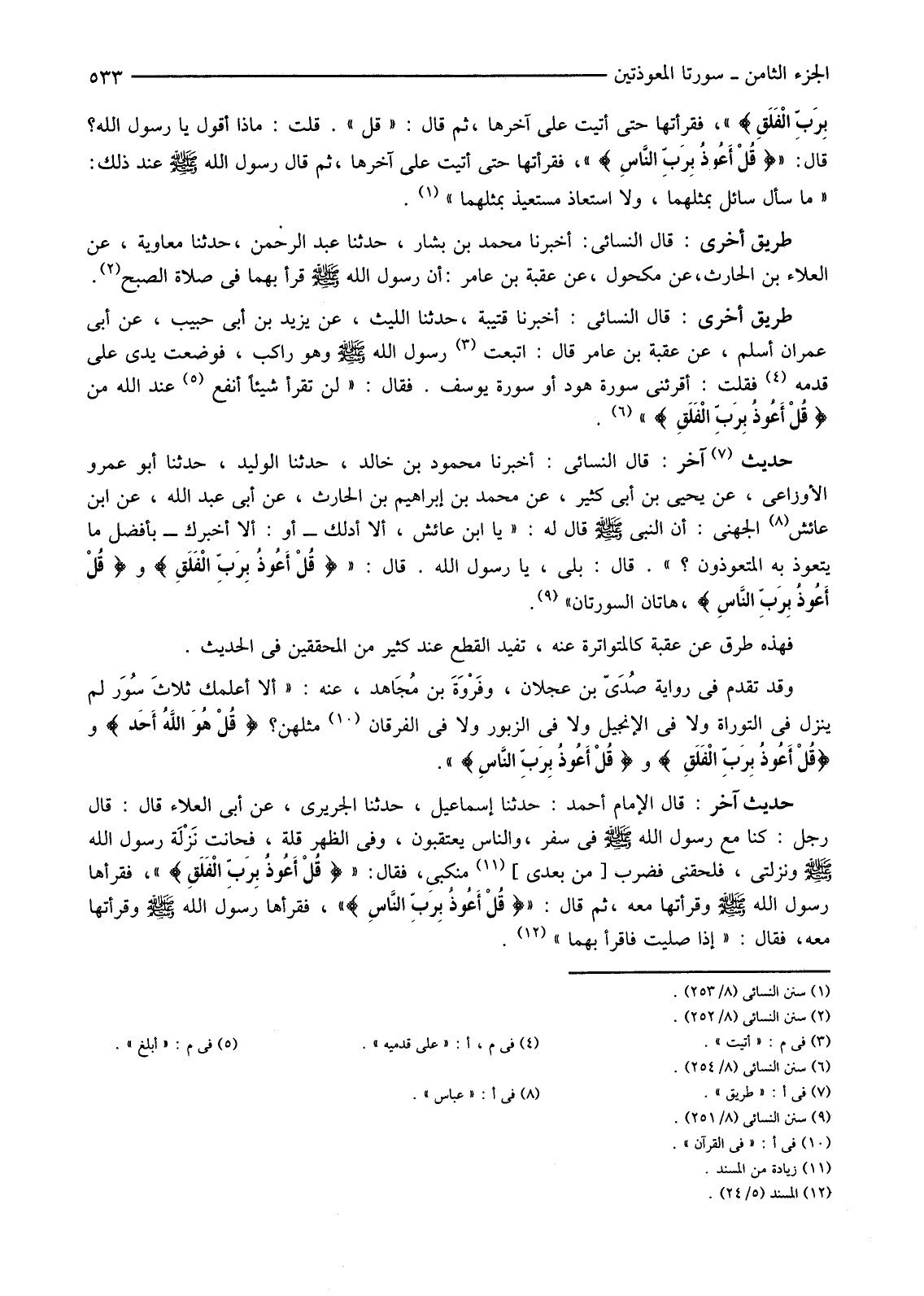 وَقَدْ تَقَدَّمَ فِي رِوَايَةِ صُدَيّ بْنِ عَجْلَانَ، وفَرْوَةَ بْنِ مُجَاهد، عَنْهُ: "أَلَا أُعَلِّمُكَ ثلاثَ سُوَر لِمَ يَنْزِلْ فِي التَّوْرَاةِ وَلَا فِي الْإِنْجِيلِ وَلَا فِي الزَّبُورِ وَلَا فِي الْفُرْقَانِ (10) مِثْلُهُنَّ؟ " قُلْ هُوَ اللَّهُ أَحَدٌ " وَ " قُلْ أَعُوذُ بِرَبِّ الْفَلَقِ " وَ " قُلْ أَعُوذُ بِرَبِّ النَّاسِ ".