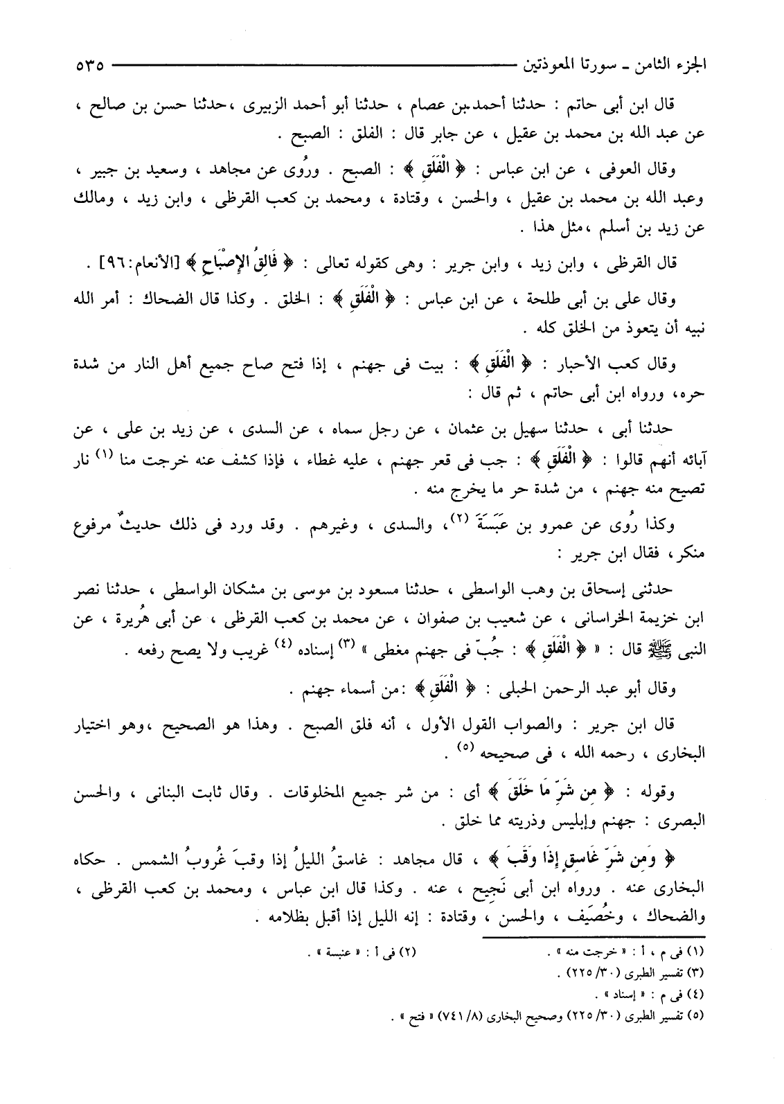 قَالَ ابْنُ جَرِيرٍ: وَالصَّوَابُ الْقَوْلُ الْأَوَّلُ، أَنَّهُ فَلَقُ الصُّبْحِ. وَهَذَا هُوَ الصَّحِيحُ، وَهُوَ اخْتِيَارُ الْبُخَارِيُّ، رَحِمَهُ اللَّهُ، فِي صَحِيحِهِ (5) .