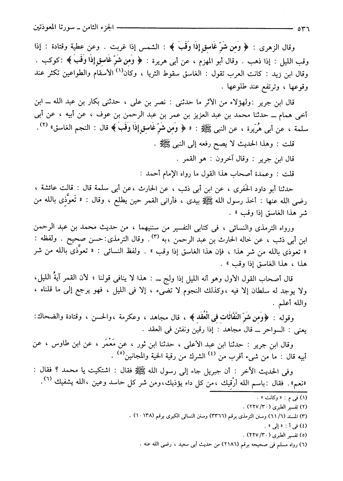 وَرَوَاهُ التِّرْمِذِيُّ وَالنَّسَائِيُّ، فِي كِتَابَيِ التَّفْسِيرِ مِنْ سُنَنَيْهِمَا، مِنْ حَدِيثِ مُحَمَّدِ بْنِ عَبْدِ الرَّحْمَنِ ابْنِ أَبِي ذِئْبٍ، عَنْ خَالِهِ الْحَارِثِ بْنِ عَبْدِ الرَّحْمَنِ، بِهِ (3) . وَقَالَ التِّرْمِذِيُّ: حَسَنٌ صَحِيحٌ. وَلَفَظُهُ: "تَعَوَّذِي بِاللَّهِ مِنْ شَرِّ هَذَا، فَإِنَّ هَذَا الْغَاسِقُ إِذَا وَقَبَ". وَلَفَظُ النَّسَائِيِّ: "تعوَّذي بِاللَّهِ مِنْ شَرِّ هَذَا، هَذَا الْغَاسِقُ إِذَا وَقَبَ".