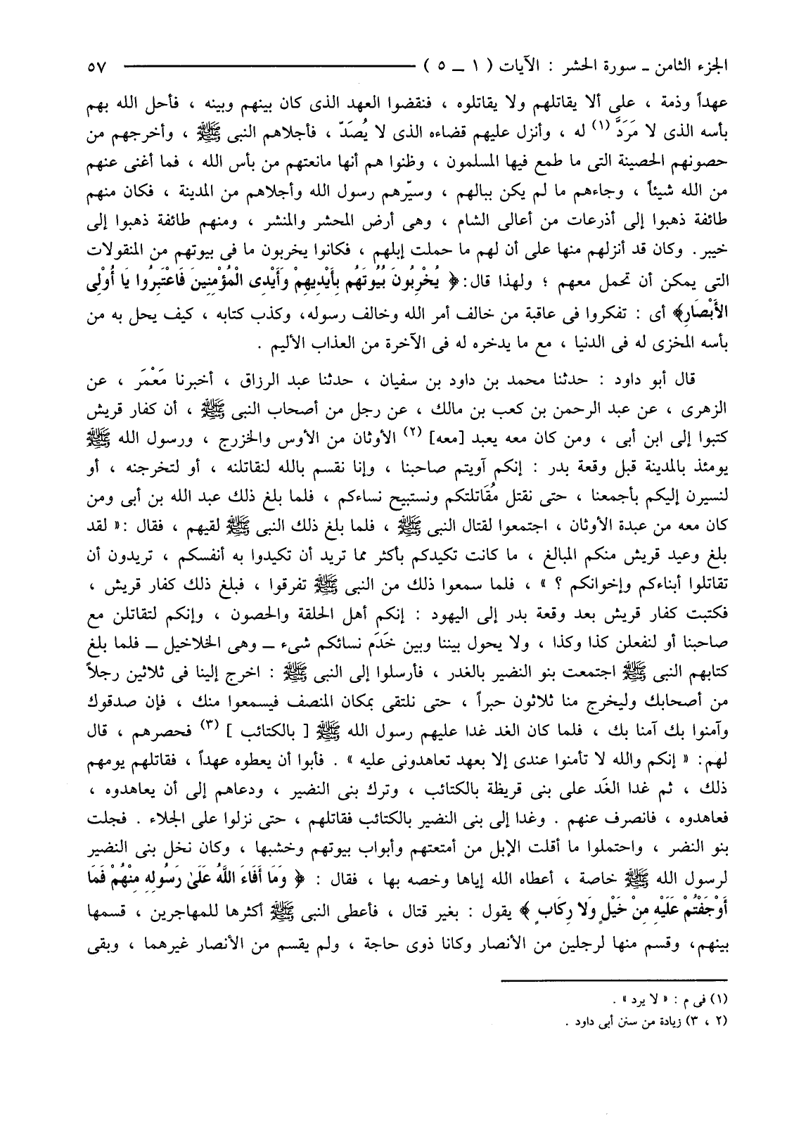 قَالَ أَبُو دَاوُدَ: حَدَّثَنَا مُحَمَّدُ بْنُ دَاوُدَ وَسُفْيَانُ، حَدَّثَنَا عَبْدُ الرَّزَّاقِ، أَخْبَرَنَا مَعْمَر، عَنِ الزُّهْرِيِّ، عَنْ عَبْدِ الرَّحْمَنِ بْنِ كَعْبِ بْنِ مَالِكٍ، عَنْ رَجُلٍ مِنْ أَصْحَابِ النَّبِيِّ صَلَّى اللَّهُ عَلَيْهِ وَسَلَّمَ، أَنَّ كُفَّارَ قُرَيْشٍ كَتَبُوا إِلَى ابْنِ أُبَيٍّ، وَمَنْ كَانَ مَعَهُ يَعْبُدُ [مَعَهُ] (2) الْأَوْثَانَ مِنَ الْأَوْسِ وَالْخَزْرَجِ، وَرَسُولُ اللَّهِ صَلَّى اللَّهُ عَلَيْهِ وَسَلَّمَ يَوْمَئِذٍ بِالْمَدِينَةِ قَبْلَ وَقْعَةِ بَدْرٍ: إِنَّكُمْ آوَيْتُمْ صَاحِبَنَا، وَإِنَّا نُقْسِمُ بِاللَّهِ لَنُقَاتِلَنَّهُ، أَوْ لَتُخْرِجُنَّهُ، أَوْ لَنَسِيرَنَّ إِلَيْكُمْ بِأَجْمَعِنَا، حَتَّى نَقْتُلَ مُقَاتلتكم وَنَسْتَبِيحَ نِسَاءَكُمْ، فَلَمَّا بَلَغَ ذَلِكَ عَبْدَ اللَّهِ بْنَ أُبَيٍّ وَمَنْ كَانَ مَعَهُ مِنْ عَبَدَةِ الْأَوْثَانِ، اجْتَمَعُوا لِقِتَالِ النَّبِيِّ صَلَّى اللَّهُ عَلَيْهِ وَسَلَّمَ، فَلَمَّا بَلَغَ ذَلِكَ النَّبِيَّ صَلَّى اللَّهُ عَلَيْهِ وَسَلَّمَ لَقِيَهُمْ، فَقَالَ: "لَقَدْ بَلَغَ وَعِيدُ قُرَيْشٍ مِنْكُمُ الْمَبَالِغَ، مَا كَانَتْ تَكِيدُكُمْ بِأَكْثَرَ مِمَّا تُرِيدُ أَنْ تَكِيدُوا بِهِ أَنْفُسَكُمْ، تُرِيدُونَ أَنْ تُقَاتِلُوا أَبْنَاءَكُمْ وَإِخْوَانَكُمْ؟ "، فَلَمَّا سَمِعُوا ذَلِكَ مِنَ النَّبِيِّ صَلَّى اللَّهُ عَلَيْهِ وَسَلَّمَ تَفَرَّقُوا، فَبَلَغَ ذَلِكَ كَفَّارَ قُرَيْشٍ، فَكَتَبَتْ كَفَّارُ قُرَيْشٍ بَعْدَ وَقْعَةِ بَدْرٍ إِلَى الْيَهُودِ: إِنَّكُمْ أَهْلُ الْحَلْقَةِ وَالْحُصُونِ، وَإِنَّكُمْ لَتُقَاتِلُّنَ مَعَ صَاحِبِنَا أَوْ لَنَفْعَلَنَّ كَذَا وَكَذَا، وَلَا يَحُولُ بَيْنَنَا وَبَيْنَ خَدَمِ نِسَائِكُمْ شَيْءٌ -وَهِيَ الْخَلَاخِيلُ -فَلَمَّا بَلَغَ كِتَابُهُمُ النَّبِيَّ صَلَّى اللَّهُ عَلَيْهِ وَسَلَّمَ اجْتَمَعَتْ بَنُو النَّضِيرِ بِالْغَدْرِ، فَأَرْسَلُوا إِلَى النَّبِيِّ صَلَّى اللَّهُ عَلَيْهِ وَسَلَّمَ: اخْرُجْ إِلَيْنَا فِي ثَلَاثِينَ رَجُلًا مِنْ أَصْحَابِكَ لِيَخْرُجَ مِنَّا ثَلَاثُونَ حَبْرًا، حَتَّى نَلْتَقِيَ بِمَكَانِ الْمَنْصَفِ فَيَسْمَعُوا مِنْكَ، فَإِنْ صَدَّقُوكَ وَآمَنُوا بِكَ آمَنَّا بِكَ، فَلَمَّا كَانَ الْغَدُ غَدَا عَلَيْهِمْ رَسُولُ اللَّهِ صَلَّى اللَّهُ عَلَيْهِ وَسَلَّمَ [بِالْكَتَائِبِ] (3) فَحَصَرَهُمْ، قَالَ لَهُمْ: "إِنَّكُمْ وَاللَّهِ لَا تَأْمَنُوا عِنْدِي إِلَّا بِعَهْدٍ تُعَاهِدُونِي عَلَيْهِ". فَأَبَوْا أَنْ يُعْطُوهُ عَهْدًا، فَقَاتَلَهُمْ يَوْمَهُمْ ذَلِكَ، ثُمَّ غَدَا الغَد عَلَى بَنِي قُرَيْظَةَ بِالْكَتَائِبِ، وَتَرَكَ بَنِي النَّضِيرِ، وَدَعَاهُمْ إِلَى أَنْ يُعَاهِدُوهُ، فَعَاهَدُوهُ، فَانْصَرَفَ عَنْهُمْ. وَغَدَا إِلَى بَنِي النَّضِيرِ بِالْكَتَائِبِ فَقَاتَلَهُمْ، حَتَّى نَزَلُوا عَلَى الْجَلَاءِ. فَجَلَتْ بَنُو النَّضِيرِ، وَاحْتَمَلُوا مَا أَقَلَّتِ الْإِبِلُ مِنْ أَمْتِعَتِهِمْ وَأَبْوَابِ بُيُوتِهِمْ وَخَشَبِهَا، وَكَانَ نَخْلُ بَنِي النَّضِيرِ لِرَسُولِ اللَّهِ صَلَّى اللَّهُ عَلَيْهِ وَسَلَّمَ خَاصَّةً، أَعْطَاهُ اللَّهُ أَيَّاهَا وَخَصَّهُ بِهَا، فَقَالَ: {وَمَا أَفَاءَ اللَّهُ عَلَى رَسُولِهِ مِنْهُمْ فَمَا أَوْجَفْتُمْ عَلَيْهِ مِنْ خَيْلٍ وَلا رِكَابٍ} يَقُولُ: بِغَيْرِ قِتَالٍ، فَأَعْطَى النَّبِيُّ صَلَّى اللَّهُ عَلَيْهِ وَسَلَّمَ أَكْثَرَهَا لِلْمُهَاجِرِينَ، قَسَّمَهَا بَيْنَهُمْ، وَقَسَّمَ مِنْهَا لِرَجُلَيْنِ مِنَ الْأَنْصَارِ وَكَانَا ذَوَيْ حَاجَةٍ، وَلَمْ يُقَسَّمْ مِنَ الأنصار غيرهما، وبقي