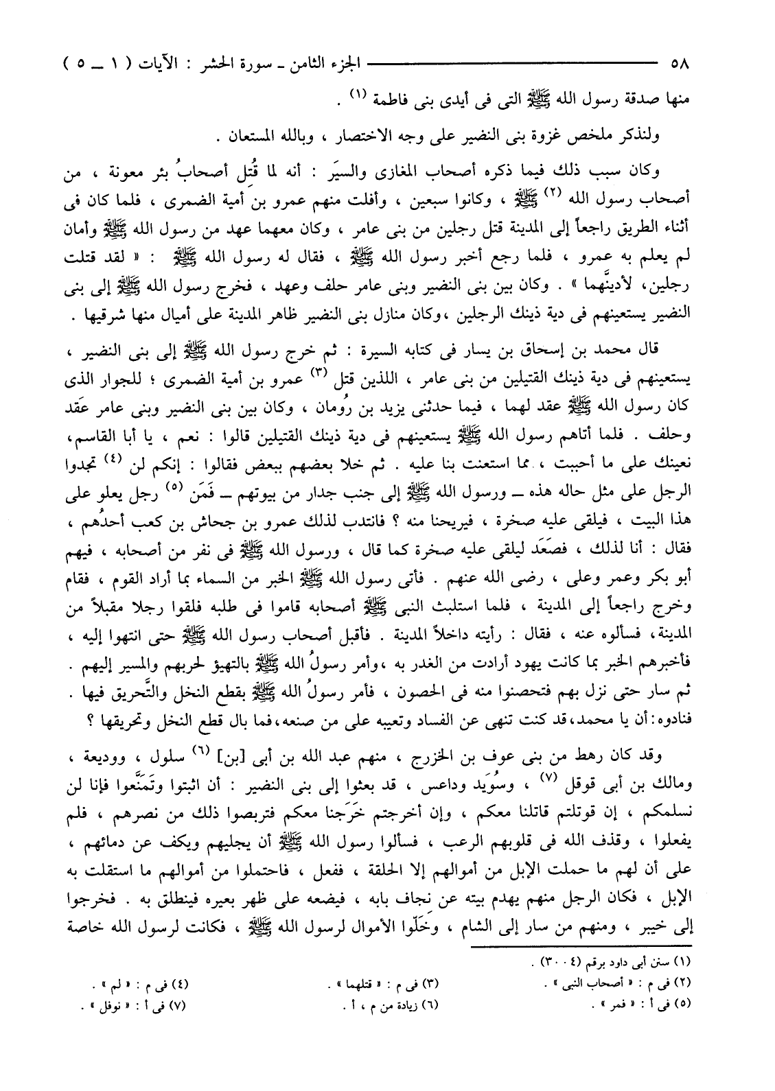 قَالَ مُحَمَّدُ بْنُ إِسْحَاقَ بْنِ يَسَارٍ فِي كِتَابِهِ السِّيرَةِ: ثُمَّ خَرَجَ رَسُولُ اللَّهِ إِلَى بَنِي النَّضِيرِ، يَسْتَعِينُهُمْ فِي دِيَةِ ذَيْنِكَ الْقَتِيلَيْنِ مِنْ بَنِي عَامِرٍ، اللَّذَيْنِ قَتَلَ (3) عَمْرُو بْنُ أُمَيَّةَ الضَّمْرِيُّ؛ لِلْجِوَارِ الَّذِي كَانَ رَسُولُ اللَّهِ صَلَّى اللَّهُ عَلَيْهِ وَسَلَّمَ عَقَدَ لَهُمَا، فِيمَا حَدَّثَنِي يَزِيدُ بْنُ رُومان، وَكَانَ بَيْنَ بَنِي النَّضِيرِ وَبَنِي عَامِرٍ عَقد وَحِلْفٌ. فَلَمَّا أَتَاهُمْ رَسُولُ اللَّهِ صَلَّى اللَّهُ عَلَيْهِ وَسَلَّمَ يَسْتَعِينُهُمْ فِي دِيَةِ ذَيْنِكَ الْقَتِيلَيْنِ قَالُوا: نَعَمْ، يَا أَبَا الْقَاسِمِ، نُعِينُكَ عَلَى مَا أَحْبَبْتَ، مِمَّا اسْتَعَنْتَ بِنَا عَلَيْهِ. ثُمَّ خَلَا بَعْضُهُمْ بِبَعْضٍ فَقَالُوا: إِنَّكُمْ لَنْ (4) تَجِدُوا الرَّجُلَ عَلَى مِثْلِ حَالِهِ هَذِهِ -وَرَسُولُ اللَّهِ صَلَّى اللَّهُ عَلَيْهِ وَسَلَّمَ إِلَى جَنْبِ جِدَارٍ مِنْ بُيُوتِهِمْ-فَمَن (5) رَجُلٌ يَعْلُو عَلَى هَذَا الْبَيْتِ، فَيُلْقِي عَلَيْهِ صَخْرَةً، فَيُرِيحُنَا مِنْهُ؟ فَانْتُدِبَ لِذَلِكَ عَمْرُو بْنُ جِحَاشِ بْنِ كَعْبٍ أحدُهم، فَقَالَ: أَنَا لِذَلِكَ، فصعَدَ لِيُلْقِيَ عَلَيْهِ صَخْرَةً كَمَا قَالَ، وَرَسُولُ اللَّهِ صَلَّى اللَّهُ عَلَيْهِ وَسَلَّمَ فِي نَفَرٍ مِنْ أَصْحَابِهِ، فِيهِمْ أَبُو بَكْرٍ وَعُمَرُ وَعَلِيٌّ، رَضِيَ اللَّهُ عَنْهُمْ. فَأَتَى رَسُولَ اللَّهِ صَلَّى اللَّهُ عَلَيْهِ وَسَلَّمَ الْخَبَرُ مِنَ السَّمَاءِ بِمَا أَرَادَ الْقَوْمُ، فَقَامَ وَخَرَجَ رَاجِعًا إِلَى الْمَدِينَةِ، فَلَمَّا اسْتَلْبَثَ النَّبِيَّ صَلَّى اللَّهُ عَلَيْهِ وَسَلَّمَ أَصْحَابُهُ قَامُوا فِي طَلَبِهِ فَلَقُوا رَجُلًا مُقْبِلًا مِنَ الْمَدِينَةِ، فَسَأَلُوهُ عَنْهُ، فَقَالَ: رَأَيْتُهُ دَاخِلًا الْمَدِينَةَ. فَأَقْبَلَ أَصْحَابُ رَسُولِ اللَّهِ صَلَّى اللَّهُ عَلَيْهِ وَسَلَّمَ حَتَّى انْتَهَوْا إِلَيْهِ، فَأَخْبَرَهُمُ الْخَبَرَ بِمَا كَانَتْ يَهُودُ أَرَادَتْ مِنَ الْغَدْرِ بِهِ، وَأَمَرَ رسولُ اللَّهِ صَلَّى اللَّهُ عَلَيْهِ وَسَلَّمَ بِالتَّهَيُّؤِ لِحَرْبِهِمْ وَالْمَسِيرِ إِلَيْهِمْ. ثُمَّ سَارَ حَتَّى نَزَلَ بِهِمْ فَتَحَصَّنُوا مِنْهُ فِي الْحُصُونِ، فَأَمَرَ رسولُ اللَّهِ صَلَّى اللَّهُ عَلَيْهِ وَسَلَّمَ بِقَطْعِ النَّخْلِ والتَّحريق فِيهَا. فَنَادَوْهُ: أَنْ يَا مُحَمَّدُ، قَدْ كُنْتَ تَنْهَى عَنِ الْفَسَادِ وَتَعِيبُهُ عَلَى مَنْ صَنَعَهُ، فَمَا بَالُ قَطْعِ النَّخْلِ وَتَحْرِيقِهَا؟