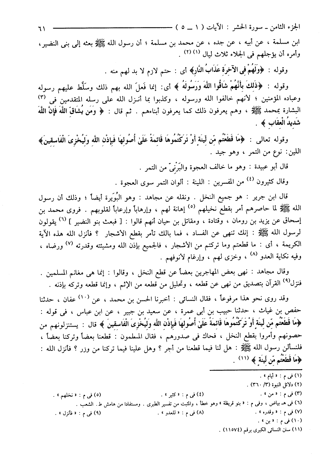 وَقَالَ مُجَاهِدٌ: نَهَى بَعْضُ الْمُهَاجِرِينَ بَعْضًا عَنْ قَطْعِ النَّخْلِ، وَقَالُوا: إِنَّمَا هِيَ مَغَانِمُ الْمُسْلِمِينَ. فَنَزَلَ (9) الْقُرْآنُ بِتَصْدِيقِ مَنْ نَهَى عَنْ قَطْعِهِ، وَتَحْلِيلِ مَنْ قَطَعَهُ مِنَ الْإِثْمِ، وَإِنَّمَا قَطْعُهُ وَتَرْكُهُ بِإِذْنِهِ. وَقَدْ رُوِيَ نَحْوُ هَذَا مَرْفُوعًا، فَقَالَ النَّسَائِيُّ: أَخْبَرَنَا الْحَسَنُ بْنُ مُحَمَّدٍ، عَنْ (10) عَفَّانَ، حَدَّثَنَا حَفْصُ بْنُ غِيَاثٍ، حَدَّثَنَا حَبِيبُ بْنُ أَبِي عَمْرَةَ، عَنْ سَعِيدِ بْنِ جُبَيْرٍ، عَنِ ابْنِ عَبَّاسٍ، فِي قَوْلِهِ: {مَا قَطَعْتُمْ مِنْ لِينَةٍ أَوْ تَرَكْتُمُوهَا قَائِمَةً عَلَى أُصُولِهَا فَبِإِذْنِ اللَّهِ وَلِيُخْزِيَ الْفَاسِقِينَ} قَالَ: يَسْتَنْزِلُونَهُمْ مِنْ حُصُونِهِمْ وَأَمَرُوا بِقَطْعِ النَّخْلِ، فَحَاكَ فِي صُدُورِهِمْ، فَقَالَ الْمُسْلِمُونَ: قَطَعْنَا بَعْضًا وَتَرَكْنَا بَعْضًا، فَلْنَسْأَلَنَّ رَسُولُ اللَّهِ صَلَّى اللَّهُ عَلَيْهِ وَسَلَّمَ: هَلْ لَنَا فِيمَا قَطَعْنَا مَنْ أَجْرٍ؟ وَهَلْ عَلَيْنَا فِيمَا تَرَكْنَا مَنْ وِزْرٍ؟ فَأَنْزَلَ الله: {مَا قَطَعْتُمْ مِنْ لِينَةٍ} (11)