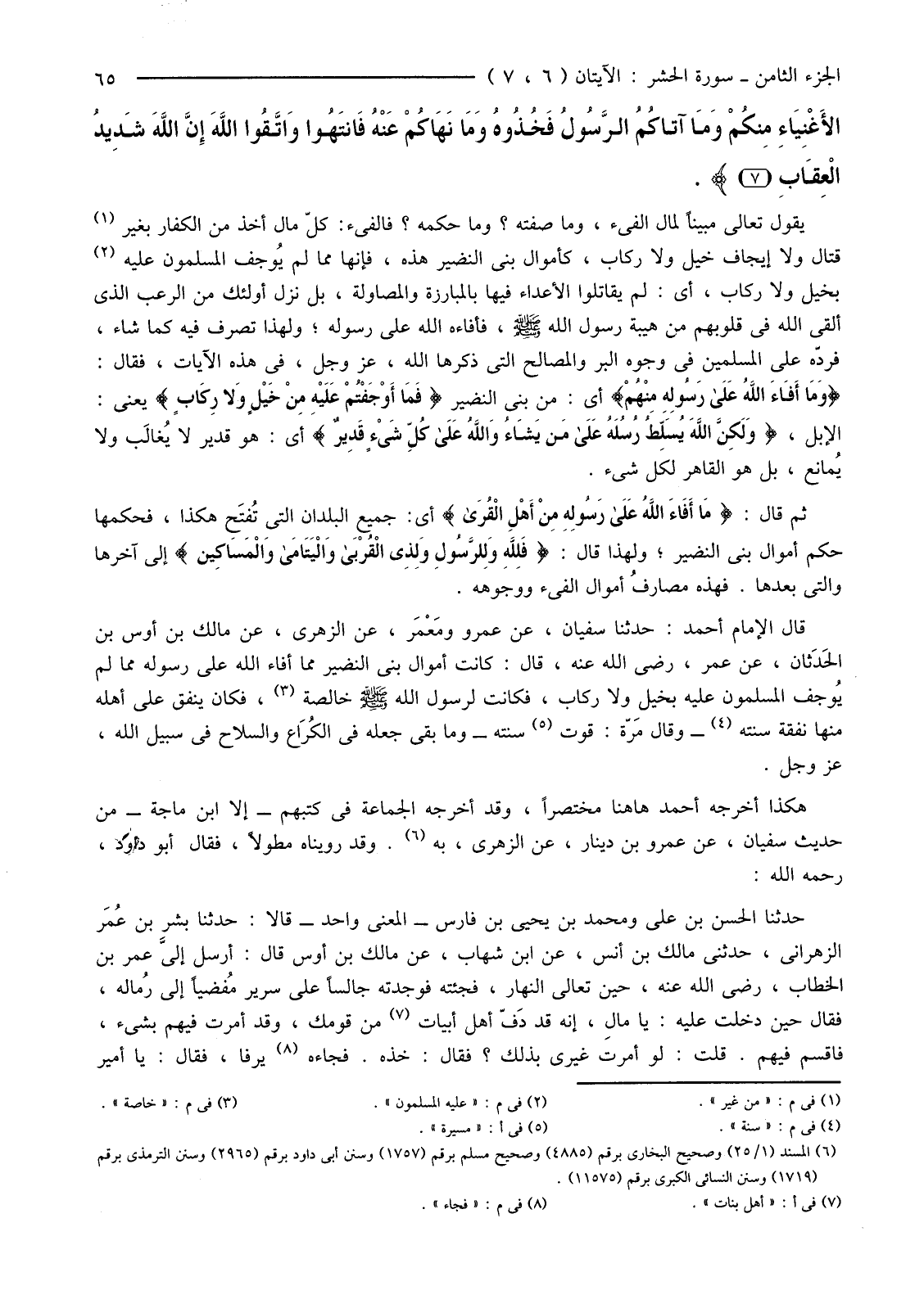 قَالَ الْإِمَامُ أَحْمَدُ: حَدَّثَنَا سُفْيَانُ، عَنْ عَمْرٍو ومَعْمَر، عَنِ الزُّهْرِيِّ، عَنْ مَالِكِ بْنِ أَوْسِ بْنِ الحَدَثان، عَنْ عُمَرَ، رَضِيَ اللَّهُ عَنْهُ، قَالَ: كَانَتْ أَمْوَالُ بَنِي النَّضِيرِ مِمَّا أَفَاءَ اللَّهُ إِلَى رَسُولِهِ مِمَّا لَمْ يُوجف الْمُسْلِمُونَ عَلَيْهِ بَخِيلٍ وَلَا رِكَابٍ، فَكَانَتْ لِرَسُولِ اللَّهِ صَلَّى اللَّهُ عَلَيْهِ وَسَلَّمَ خَالِصَةً (3) فَكَانِ يُنْفِقُ عَلَى أَهْلِهِ مِنْهَا نَفَقَةَ سَنَتِهِ (4) -وَقَالَ مَرّة: قُوتَ (5) سَنَتِهِ-وَمَا بَقِيَ جَعَلَهُ فِي الكُرَاع وَالسِّلَاحِ فِي سَبِيلِ اللَّهِ، عَزَّ وَجَلَّ.