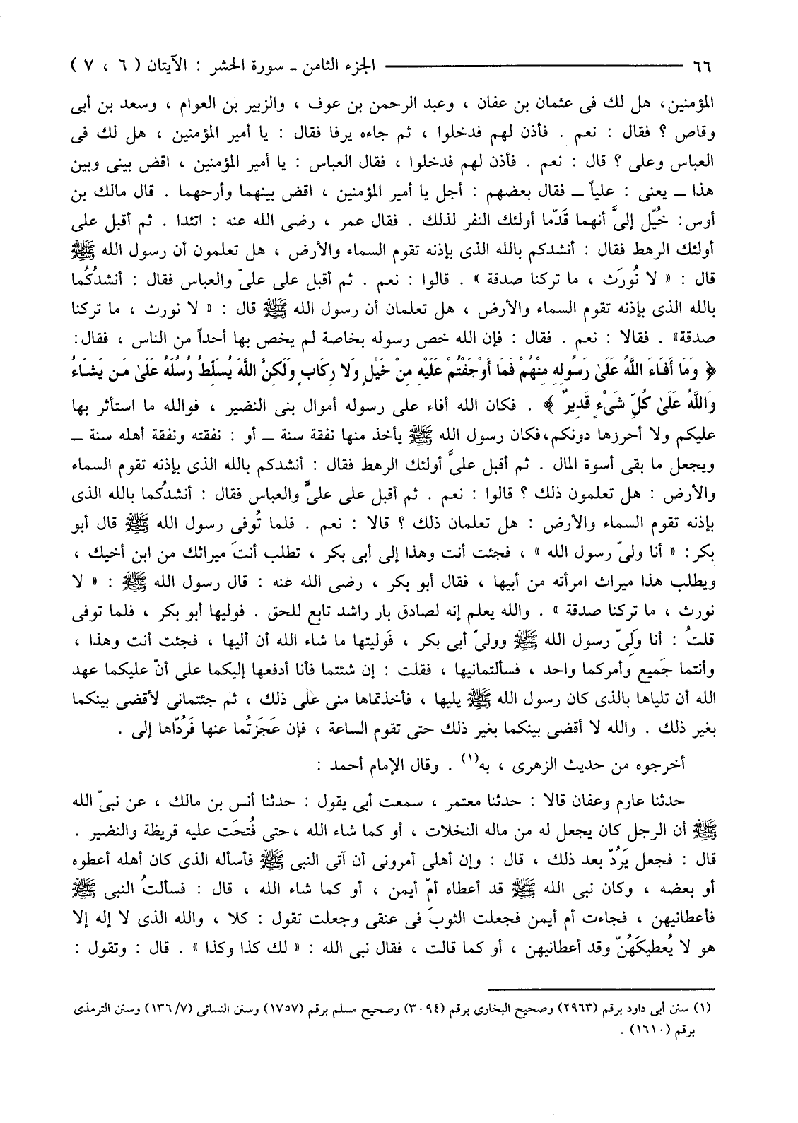 الْمُؤْمِنِينَ، هَلْ لَكَ فِي عُثْمَانَ بْنَ عَفَّانَ، وَعَبْدَ الرَّحْمَنِ بْنَ عَوْفٍ، وَالزُّبَيْرِ بْنِ الْعَوَّامِ، وَسَعْدِ بْنِ أَبِي وَقَّاصٍ؟ فَقَالَ: نَعَمْ. فَأَذِنَ لَهُمْ فَدَخَلُوا، ثُمَّ جَاءَهُ يَرْفَا فَقَالَ: يَا أَمِيرَ الْمُؤْمِنِينَ، هَلْ لَكَ فِي الْعَبَّاسِ وَعَلِيٍّ؟ قَالَ: نَعَمْ. فَأَذِنَ لَهُمْ فَدَخَلُوا، فَقَالَ الْعَبَّاسُ: يَا أَمِيرَ الْمُؤْمِنِينَ، اقْضِ بَيْنِي وَبَيْنَ هَذَا -يَعْنِي: عَلِيًّا-فَقَالَ بَعْضُهُمْ: أَجَلْ يَا أَمِيرَ الْمُؤْمِنِينَ، اقْضِ بَيْنَهُمَا وَأَرِحْهُمَا. قَالَ مَالِكُ بْنُ أَوْسٍ: خُيّل إليَّ أَنَّهُمَا قَدّما أُولَئِكَ النَّفَرَ لِذَلِكَ. فَقَالَ عُمَرُ، رَضِيَ اللَّهُ عَنْهُ: اتَّئِدَا. ثُمَّ أَقْبَلَ عَلَى أُولَئِكَ الرَّهْطِ فَقَالَ: أَنْشُدُكُمْ بِاللَّهِ الَّذِي بِإِذْنِهِ تَقُومُ السَّمَاءُ وَالْأَرْضُ، هَلْ تَعْلَمُونَ أَنَّ رَسُولَ اللَّهِ صَلَّى اللَّهُ عَلَيْهِ وَسَلَّمَ قَالَ: "لَا نُورَث، مَا تَرَكْنَا صَدَقَةٌ". قَالُوا: نَعَمْ. ثُمَّ أَقْبَلَ عَلَى عَلِيٍّ وَالْعَبَّاسِ فَقَالَ: أنشدُكُما بِاللَّهِ الَّذِي بِإِذْنِهِ تَقُومُ السَّمَاءُ وَالْأَرْضُ، هَلْ تَعْلَمَانِ أَنَّ رَسُولَ اللَّهِ صَلَّى اللَّهُ عَلَيْهِ وَسَلَّمَ قَالَ: "لَا نُورَثُ، مَا تَرَكْنَا صَدَقَةٌ". فَقَالَا نَعَمْ. فَقَالَ: فَإِنَّ اللَّهَ خَصَّ رَسُولَهُ بِخَاصَّةٍ لَمْ يَخُصَّ بِهَا أَحَدًا مِنَ النَّاسِ، فَقَالَ: {وَمَا أَفَاءَ اللَّهُ عَلَى رَسُولِهِ مِنْهُمْ فَمَا أَوْجَفْتُمْ عَلَيْهِ مِنْ خَيْلٍ وَلا رِكَابٍ وَلَكِنَّ اللَّهَ يُسَلِّطُ رُسُلَهُ عَلَى مَنْ يَشَاءُ وَاللَّهُ عَلَى كُلِّ شَيْءٍ قَدِيرٌ} فَكَانَ اللَّهُ أَفَاءَ إِلَى رَسُولِهِ أَمْوَالَ بَنِي النَّضِيرِ، فَوَاللَّهِ مَا اسْتَأْثَرَ بِهَا عَلَيْكُمْ وَلَا أَحْرَزَهَا دُونَكُمْ، فَكَانَ رَسُولُ اللَّهِ صَلَّى اللَّهُ عَلَيْهِ وَسَلَّمَ يَأْخُذُ مِنْهَا نَفَقَةَ سَنَةٍ -أَوْ: نَفَقَتَهُ وَنَفَقَةَ أَهْلِهِ سَنَةً-وَيَجْعَلُ مَا بَقِيَ أُسْوَةَ الْمَالِ. ثُمَّ أَقْبَلَ عليَّ أُولَئِكَ الرَّهْطِ فَقَالَ: أَنْشُدُكُمْ بِاللَّهِ الَّذِي بِإِذْنِهِ تَقُومُ السَّمَاءُ وَالْأَرْضُ: هَلْ تَعْلَمُونَ ذَلِكَ؟ قَالُوا: نَعَمْ. ثُمَّ أَقْبَلَ عَلَى عليٍّ وَالْعَبَّاسِ فَقَالَ: أنشدُكما بِاللَّهِ الَّذِي بِإِذْنِهِ تَقُومُ السَّمَاءُ وَالْأَرْضُ: هَلْ تَعْلَمَانِ ذَلِكَ؟ قَالَا نَعَمْ. فَلَمَّا تُوفي رَسُولُ اللَّهِ صَلَّى اللَّهُ عَلَيْهِ وَسَلَّمَ قَالَ أَبُو بَكْرٍ: "أَنَا وَلِيُّ رَسُولِ اللَّهِ"، فَجِئْتَ أنتَ وَهَذَا إِلَى أَبِي بَكْرٍ، تَطْلُبُ أَنْتَ مِيرَاثَكَ عَنِ ابْنِ أَخِيكَ، وَيَطْلُبُ هَذَا مِيرَاثَ امْرَأَتِهِ مِنْ أَبِيهَا، فَقَالَ أَبُو بَكْرٍ، رَضِيَ اللَّهُ عَنْهُ: قَالَ رَسُولُ اللَّهِ صَلَّى اللَّهُ عَلَيْهِ وَسَلَّمَ: "لَا نُورَثُ، مَا تَرَكْنَا صَدَقَةٌ". وَاللَّهُ يَعْلَمُ إِنَّهُ لَصَادِقٌ بَارٌّ رَاشِدٌ تَابِعٌ لِلْحَقِّ. فَوَلِيَهَا أَبُو بَكْرٍ، فَلَمَّا تُوُفِّيَ قلتُ: أَنَا وَلِيّ رَسُولِ اللَّهِ صَلَّى اللَّهُ عَلَيْهِ وَسَلَّمَ وَوَلِيُّ أَبِي بَكْرٍ، فَوليتها مَا شَاءَ اللَّهُ أَنْ أَلِيَهَا، فَجِئْتَ أَنْتَ وَهَذَا، وَأَنْتُمَا جَميع وَأَمْرُكُمَا وَاحِدٌ، فَسَأَلْتُمَانِيهَا، فَقُلْتُ: إِنْ شِئْتُمَا فَأَنَا أَدْفَعُهَا إِلَيْكُمَا عَلَى أَنَّ عَلَيْكُمَا عَهْدَ اللَّهِ أَنْ تَلِيَاهَا بِالَّذِي كَانَ رَسُولُ اللَّهِ صَلَّى اللَّهُ عَلَيْهِ وَسَلَّمَ يَلِيهَا، فَأَخَذْتُمَاهَا مِنِّي عَلَى ذَلِكَ، ثُمَّ جِئْتُمَانِي لِأَقْضِيَ بَيْنَكُمَا بِغَيْرِ ذَلِكَ. وَاللَّهِ لَا أَقْضِي بَيْنَكُمَا بِغَيْرِ ذَلِكَ حَتَّى تَقُومَ السَّاع