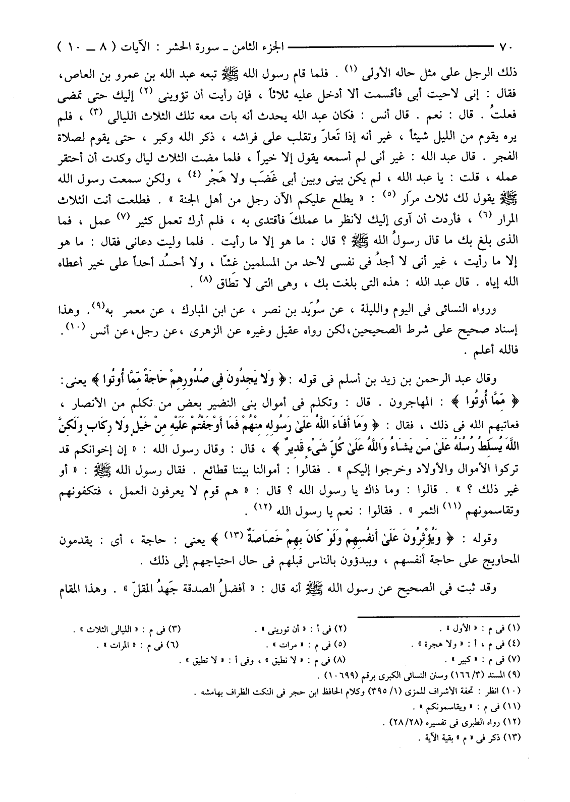 وَقَالَ عَبْدُ الرَّحْمَنِ بْنُ زَيْدِ بْنِ أَسْلَمَ فِي قَوْلِهِ: {وَلا يَجِدُونَ فِي صُدُورِهِمْ حَاجَةً مِمَّا أُوتُوا} يَعْنِي {مِمَّا أُوتُوا} الْمُهَاجِرُونَ. قَالَ: وَتَكَلَّمَ فِي أَمْوَالِ بَنِي النَّضِيرِ بَعْضُ مَنْ تَكَلَّمَ مِنَ الْأَنْصَارِ، فَعَاتَبَهُمُ اللَّهُ فِي ذَلِكَ، فَقَالَ: {وَمَا أَفَاءَ اللَّهُ عَلَى رَسُولِهِ مِنْهُمْ فَمَا أَوْجَفْتُمْ عَلَيْهِ مِنْ خَيْلٍ وَلا رِكَابٍ وَلَكِنَّ اللَّهَ يُسَلِّطُ رُسُلَهُ عَلَى مَنْ يَشَاءُ وَاللَّهُ عَلَى كُلِّ شَيْءٍ قَدِيرٌ} قَالَ: وَقَالَ رَسُولُ اللَّهِ: "إِنَّ إِخْوَانَكُمْ قَدْ تَرَكُوا الْأَمْوَالَ وَالْأَوْلَادَ وَخَرَجُوا إِلَيْكُمْ". فَقَالُوا: أَمْوَالُنَا بَيْنَنَا قَطَائِعُ. فَقَالَ رَسُولُ اللَّهِ صَلَّى اللَّهُ عَلَيْهِ وَسَلَّمَ: "أَوَ غَيْرُ ذَلِكَ؟ ". قَالُوا: وَمَا ذَاكَ يَا رَسُولَ اللَّهِ؟ قَالَ: "هُمْ قَوْمٌ لَا يَعْرِفُونَ الْعَمَلَ، فَتَكْفُونَهُمْ وَتُقَاسِمُونَهُمُ (11) الثَّمَرَ". فَقَالُوا: نَعَمْ يَا رَسُولَ اللَّهِ (12)