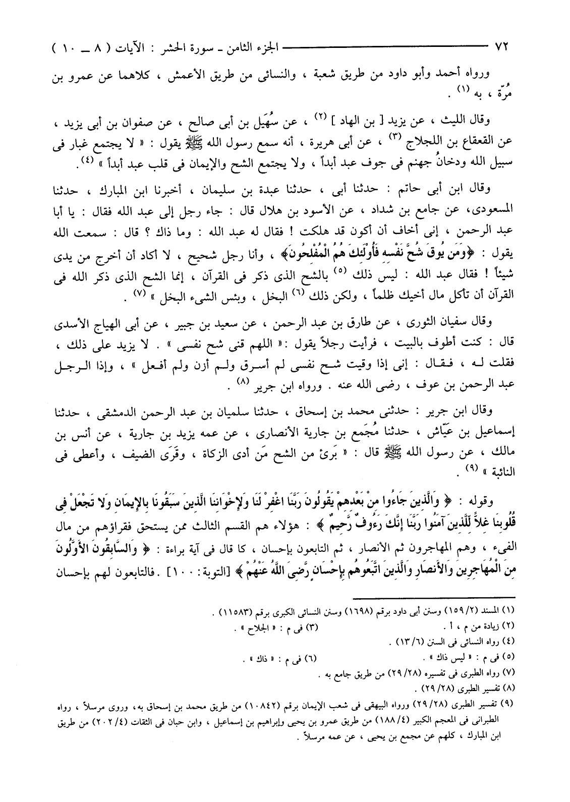 (9) تفسير الطبري (28/29) ورواه البيهقي في شعب الإيمان برقم (10842) من طريق محمد بن إسحاق به، وروي مرسلاً، رواه الطبراني في المعجم الكبير (4/188) من طريق عمرو بن يحيى وإبراهيم بن إسماعيل، وابن حبان في الثقات (4/202) من طريق ابن المبارك، كلهم عن مجمع ابن يحيى، عن عمه مرسلاً.