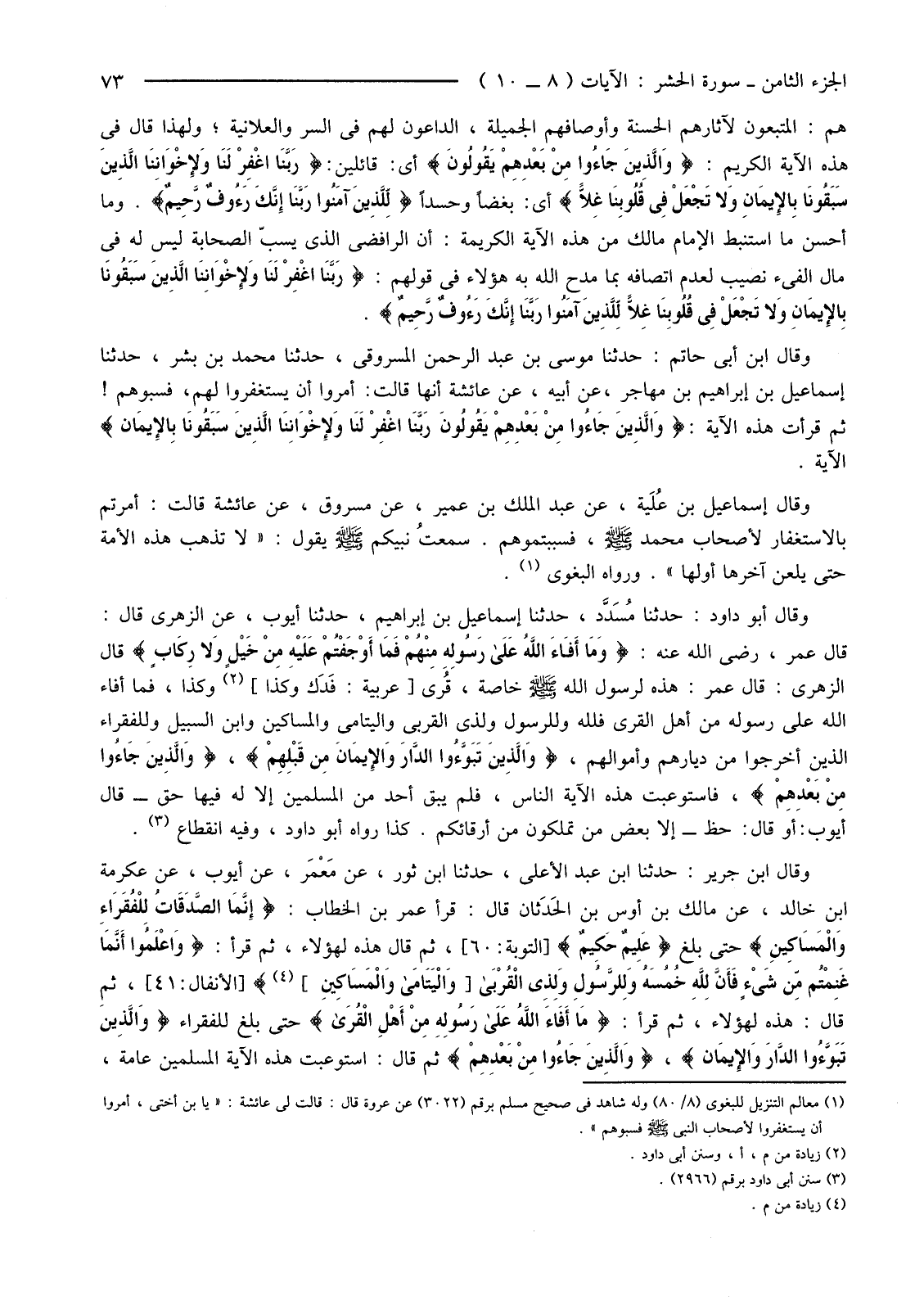 هُمُ: الْمُتَّبِعُونَ لِآثَارِهِمُ الْحَسَنَةِ وَأَوْصَافِهِمُ الْجَمِيلَةِ، الدَّاعُونَ لَهُمْ فِي السِّرِّ وَالْعَلَانِيَةِ؛ وَلِهَذَا قَالَ فِي هذه الآية الكريم: {وَالَّذِينَ جَاءُوا مِنْ بَعْدِهِمْ يَقُولُونَ} أَيْ: قَائِلِينَ: {رَبَّنَا اغْفِرْ لَنَا وَلإخْوَانِنَا الَّذِينَ سَبَقُونَا بِالإيمَانِ وَلا تَجْعَلْ فِي قُلُوبِنَا غِلا} أَيْ: بُغْضًا وَحَسَدًا {لِلَّذِينَ آمَنُوا رَبَّنَا إِنَّكَ رَءُوفٌ رَحِيمٌ} وَمَا أَحْسَنَ مَا اسْتَنْبَطَ الْإِمَامُ مَالِكٌ مِنْ هَذِهِ الْآيَةِ الْكَرِيمَةِ: أَنَّ الرَّافِضِيَّ الَّذِي يَسُبُّ الصَّحَابَةَ لَيْسَ لَهُ فِي مَالِ الْفَيْءِ نَصِيبٌ لِعَدَمِ اتِّصَافِهِ بِمَا مَدَحَ اللَّهُ بِهِ هَؤُلَاءِ فِي قَوْلِهِمْ: {رَبَّنَا اغْفِرْ لَنَا وَلإخْوَانِنَا الَّذِينَ سَبَقُونَا بِالإيمَانِ وَلا تَجْعَلْ فِي قُلُوبِنَا غِلا لِلَّذِينَ آمَنُوا رَبَّنَا إِنَّكَ رَءُوفٌ رَحِيمٌ} .