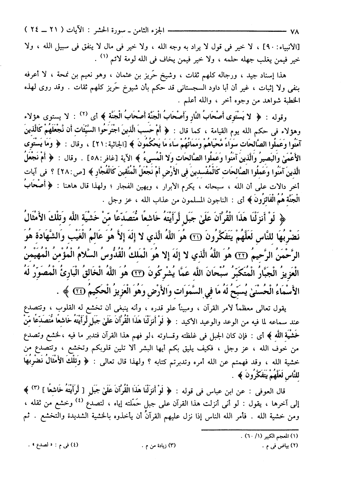 {لَوْ أَنزلْنَا هَذَا الْقُرْآنَ عَلَى جَبَلٍ لَرَأَيْتَهُ خَاشِعًا مُتَصَدِّعًا مِنْ خَشْيَةِ اللَّهِ وَتِلْكَ الأمْثَالُ نَضْرِبُهَا لِلنَّاسِ لَعَلَّهُمْ يَتَفَكَّرُونَ (21) هُوَ اللَّهُ الَّذِي لَا إِلَهَ إِلا هُوَ عَالِمُ الْغَيْبِ وَالشَّهَادَةِ هُوَ الرَّحْمَنُ الرَّحِيمُ (22) هُوَ اللَّهُ الَّذِي لَا إِلَهَ إِلا هُوَ الْمَلِكُ الْقُدُّوسُ السَّلامُ الْمُؤْمِنُ الْمُهَيْمِنُ الْعَزِيزُ الْجَبَّارُ الْمُتَكَبِّرُ سُبْحَانَ اللَّهِ عَمَّا يُشْرِكُونَ (23) هُوَ اللَّهُ الْخَالِقُ الْبَارِئُ الْمُصَوِّرُ لَهُ الأسْمَاءُ الْحُسْنَى يُسَبِّحُ لَهُ مَا فِي السَّمَاوَاتِ وَالأرْضِ وَهُوَ الْعَزِيزُ الْحَكِيمُ (24) }