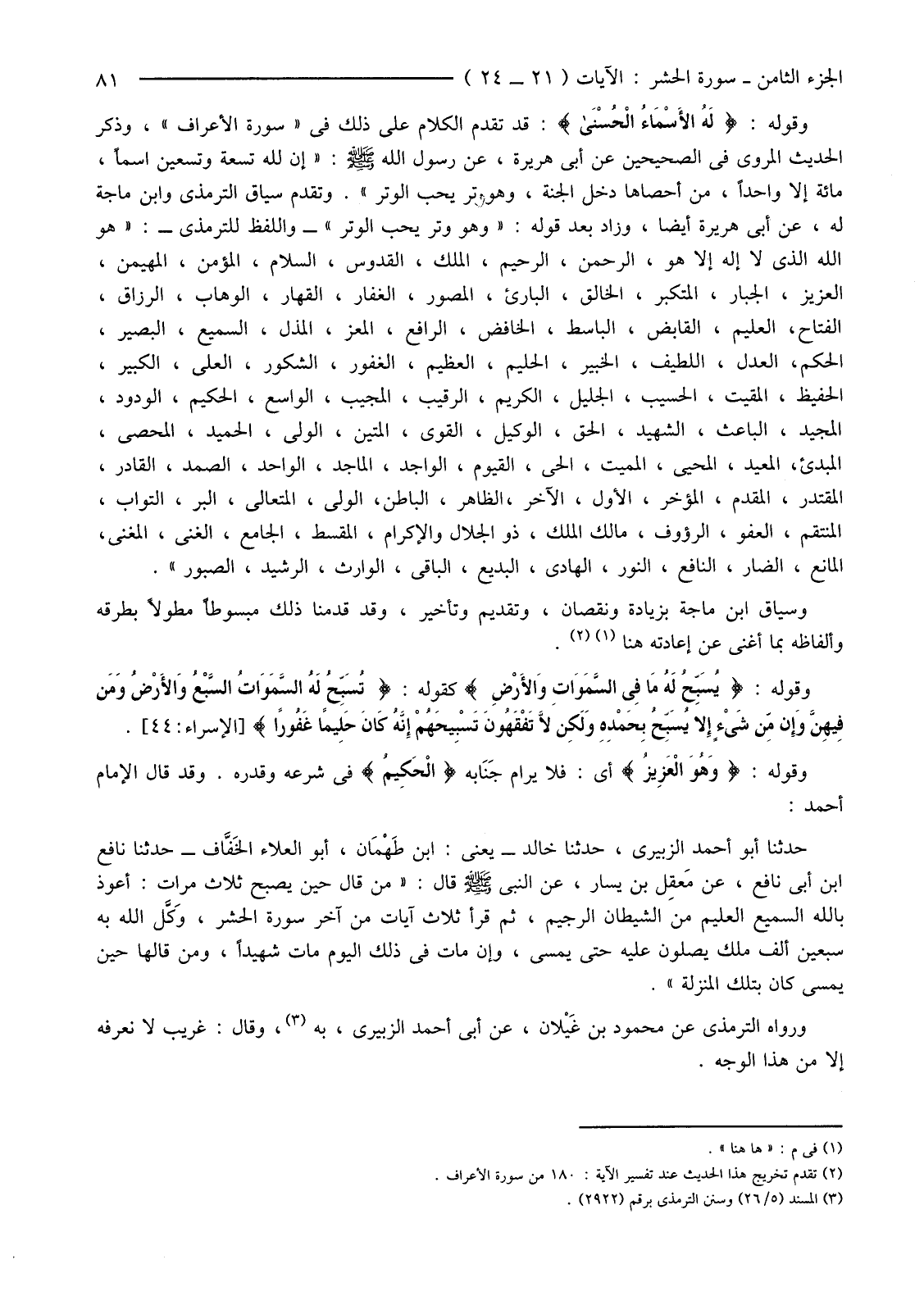 وَقَوْلُهُ: {لَهُ الأسْمَاءُ الْحُسْنَى} قَدْ تَقَدَّمَ الْكَلَامُ عَلَى ذَلِكَ فِي "سُورَةِ الْأَعْرَافِ"، وَذِكْرُ الْحَدِيثِ الْمَرْوِيِّ فِي الصَّحِيحَيْنِ عَنْ أَبِي هُرَيْرَةَ، عَنْ رَسُولِ اللَّهِ صَلَّى اللَّهُ عَلَيْهِ وَسَلَّمَ: "إِنَّ لِلَّهِ تَعَالَى تِسْعَةً وَتِسْعِينَ اسْمًا، مِائَةٌ إِلَّا وَاحِدًا، مَنْ أَحْصَاهَا دخل الجنة، وهو وتر يُحِبُّ الْوِتْرَ". وَتَقَدَّمَ سِيَاقُ التِّرْمِذِيِّ وَابْنِ مَاجَهْ لَهُ، عَنْ أَبِي هُرَيْرَةَ أَيْضًا، وَزَادَ بَعْدَ قَوْلِهِ: "وَهُوَ وِتْرٌ يُحِبُّ الْوِتْرَ" -وَاللَّفْظُ لِلتِّرْمِذِيِّ-: "هُوَ اللَّهُ الَّذِي لَا إِلَهَ إِلَّا هُوَ، الرَّحْمَنُ، الرَّحِيمُ، الْمَلِكُ، الْقُدُّوسُ، السَّلَامُ، الْمُؤْمِنُ، الْمُهَيْمِنُ، الْعَزِيزُ، الْجَبَّارُ، الْمُتَكَبِّرُ، الْخَالِقُ، الْبَارِئُ، الْمُصَوِّرُ، الْغَفَّارُ، الْقَهَّارُ، الْوَهَّابُ، الرَّزَّاقُ، الْفَتَّاحُ، الْعَلِيمُ، الْقَابِضُ، الْبَاسِطُ، الْخَافِضُ، الرَّافِعُ، الْمُعِزُّ، الْمُذِلُّ، السَّمِيعُ، الْبَصِيرُ، الْحَكَمُ، الْعَدْلُ، اللَّطِيفُ، الْخَبِيرُ، الْحَلِيمُ، الْعَظِيمُ، الْغَفُورُ، الشَّكُورُ، الْعَلِيُّ، الْكَبِيرُ، الْحَفِيظُ، الْمَقِيتُ، الْحَسِيبُ، الْجَلِيلُ، الْكَرِيمُ، الرَّقِيبُ، الْمُجِيبُ، الْوَاسِعُ، الْحَكِيمُ، الْوَدُودُ، الْمَجِيدُ، الْبَاعِثُ، الشَّهِيدُ، الْحَقُّ، الْوَكِيلُ، الْقَوِيُّ، الْمَتِينُ، الْوَلِيُّ، الْحَمِيدُ، الْمُحْصِي، الْمُبْدِئُ، الْمُعِيدُ، الْمُحْيِي، الْمُمِيتُ، الْحَيُّ، الْقَيُّومُ، الْوَاجِدُ، الْمَاجِدُ، الْوَاحِدُ، الصَّمَدُ، الْقَادِرُ، الْمُقْتَدِرُ، الْمُقَدِّمُ، الْمُؤَخِّرُ، الْأَوَّلُ، الْآخَرُ، الظاهر، الباطن، الولي، الْمُتَعَالِي، الْبَرُّ، التَّوَّابُ، الْمُنْتَقِمُ، الْعَفُوُّ، الرَّءُوفُ، مَالِكُ الْمُلْكِ، ذُو الْجَلَالِ وَالْإِكْرَامِ، الْمُقْسِطُ، الْجَامِعُ، الْغَنِيُّ، الْمُغْنِي، الْمَانِعُ، الضَّارُّ، النَّافِعُ، النُّورُ، الْهَادِي، الْبَدِيعُ، الْبَاقِي، الْوَارِثُ، الرَّشِيدُ، الصَّبُورُ".