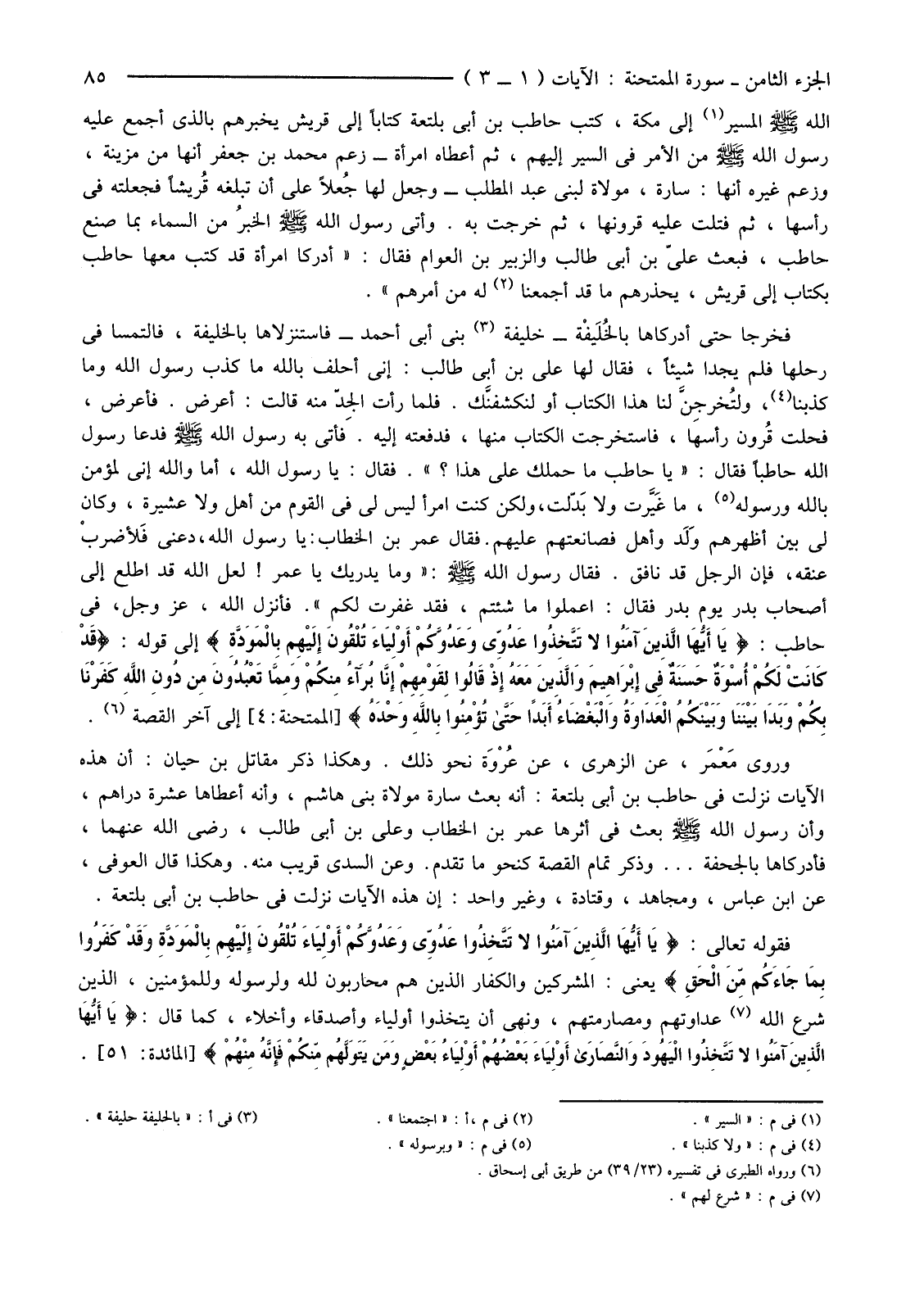 وَرَوَى مَعْمَر، عَنِ الزُّهْرِيِّ، عَنْ عُرْوَة نَحْوَ ذَلِكَ. وَهَكَذَا ذَكَرَ مُقَاتِلُ بْنُ حَيَّانَ: أَنَّ هَذِهِ الْآيَاتِ نَزَلَتْ فِي حَاطِبِ بْنِ أَبِي بَلْتَعَةَ: أَنَّهُ بَعَثَ سَارَةَ مَوْلَاةَ بَنِي هَاشِمٍ، وَأَنَّهُ أَعْطَاهَا عَشَرَةَ دَرَاهِمَ، وَأَنَّ رَسُولَ اللَّهِ صَلَّى اللَّهُ عَلَيْهِ وَسَلَّمَ بَعَثَ فِي أَثَرِهَا عُمَرُ بْنُ الْخَطَّابِ وَعَلِيُّ بْنُ أَبِي طَالِبٍ، رَضِيَ اللَّهُ عَنْهُمَا، فَأَدْرَكَاهَا بِالْجُحْفَةِ ... وَذَكَرَ تَمَامَ الْقِصَّةِ كَنَحْوِ مَا تَقَدَّمَ. وَعَنِ السُّدِّيِّ قَرِيبًا مِنْهُ. وَهَكَذَا قَالَ الْعَوْفِيُّ، عَنِ ابْنِ عَبَّاسٍ، وَمُجَاهِدٍ وَقَتَادَةَ، وَغَيْرِ وَاحِدٍ: أَنَّ هَذِهِ الْآيَاتِ نَزَلَتْ فِي حَاطِبِ بْنِ أَبِي بَلْتَعَةَ.