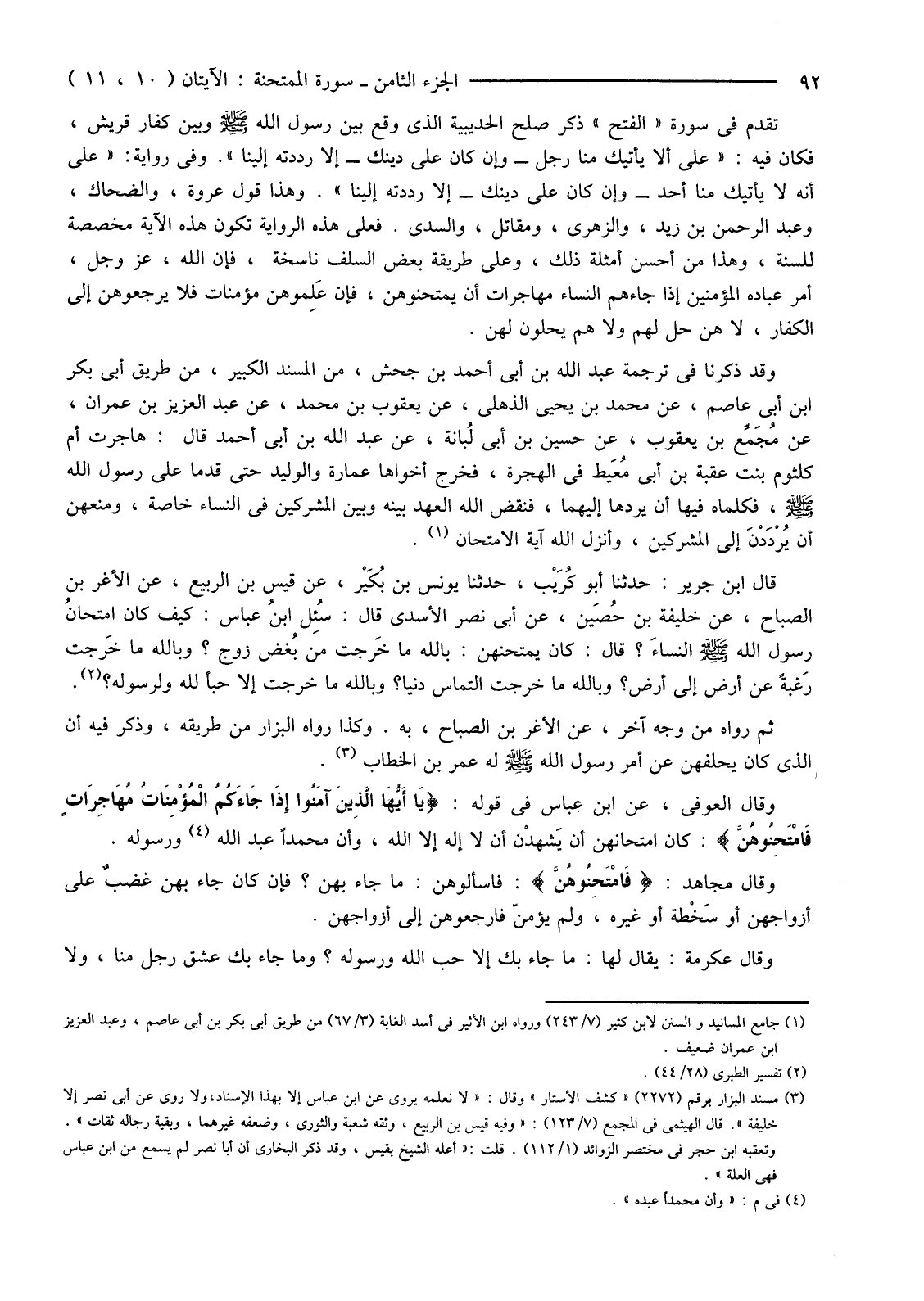تَقَدَّمَ فِي سُورَةِ "الْفَتْحِ" ذِكْرُ صُلْحِ الْحُدَيْبِيَةِ الَّذِي وَقَعَ بَيْنَ رَسُولِ اللَّهِ صَلَّى اللَّهُ عَلَيْهِ وَسَلَّمَ وَبَيْنَ كُفَّارِ قُرَيْشٍ، فَكَانَ فِيهِ: "عَلَى أَلَّا يَأْتِيكَ مِنَّا رَجُلٌ -وَإِنْ كَانَ عَلَى دِينِكَ-إِلَّا رَدَدْتَهُ إِلَيْنَا". وَفِي رِوَايَةٍ: "عَلَى أَنَّهُ لَا يَأْتِيكَ مِنَّا أَحَدٌ -وَإِنْ كَانَ عَلَى دِينِكَ-إِلَّا رَدَدْتَهُ إِلَيْنَا". وَهَذَا قَوْلُ عُرْوَةَ، وَالضَّحَّاكِ، وَعَبْدِ الرَّحْمَنِ بْنِ زَيْدٍ، وَالزُّهْرِيِّ، وَمُقَاتِلٍ، وَالسُّدِّيِّ. فَعَلَى هَذِهِ الرِّوَايَةِ تَكُونُ هَذِهِ الْآيَةُ مُخَصَّصَةً لِلسُّنَّةِ، وَهَذَا مِنْ أَحْسَنِ أَمْثِلَةِ ذَلِكَ، وَعَلَى طَرِيقَةِ بَعْضِ السَّلَفِ نَاسِخَةٌ، فَإِنَّ اللَّهَ، عَزَّ وَجَلَّ، أَمَرَ عِبَادَهُ الْمُؤْمِنِينَ إِذَا جَاءَهُمُ النِّسَاءُ مُهَاجِرَاتٍ أَنْ يَمْتَحِنُوهُنَّ، فَإِنْ عَلِموهن مُؤْمِنَاتٍ فَلَا يَرْجِعُوهُنَّ إِلَى الْكُفَّارِ، لَا هُنَّ حِلٌّ لَهُمْ وَلَا هُمْ يَحِلُّونَ لَهُنَّ.