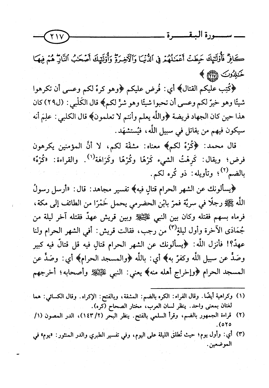 {كتب عَلَيْكُم الْقِتَال} أَي: فرض عَلَيْكُم {وَهُوَ كُرْهٌ لَكُمْ وَعَسَى أَنْ تَكْرَهُوا شَيْئًا وَهُوَ خَيْرٌ لَكُمْ وَعَسَى أَنْ تُحِبُّوا شَيْئًا وَهُوَ شَرٌّ لَكُمْ} قَالَ الْكَلْبِيّ: (ل 29) كَانَ هَذَا حِين كَانَ الْجِهَاد فَرِيضَة (وَاللَّهُ يَعْلَمُ وَأَنْتُمْ لَا تعلمُونَ} قَالَ الْكَلْبِيّ: علم أَنه سَيكون فيهم من يُقَاتل فِي سَبِيل اللَّه، فيستشهد.