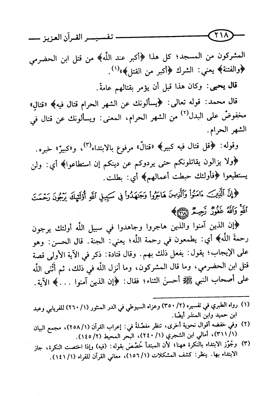 وَقَوله: {قُلْ قِتَالٌ فِيهِ كَبِيرٌ} ((قتال)) مَرْفُوع بِالِابْتِدَاءِ، و ((كَبِير)) خَبره. {وَلا يَزَالُونَ يُقَاتِلُونَكُمْ حَتَّى يَرُدُّوكُمْ عَنْ دِينِكُمْ إِنِ اسْتَطَاعُوا} أَي: وَلنْ يستطيعوا {فَأُولَئِكَ حَبِطَتْ أَعْمَالهم} أَي: بطلت. [آيَة 218]