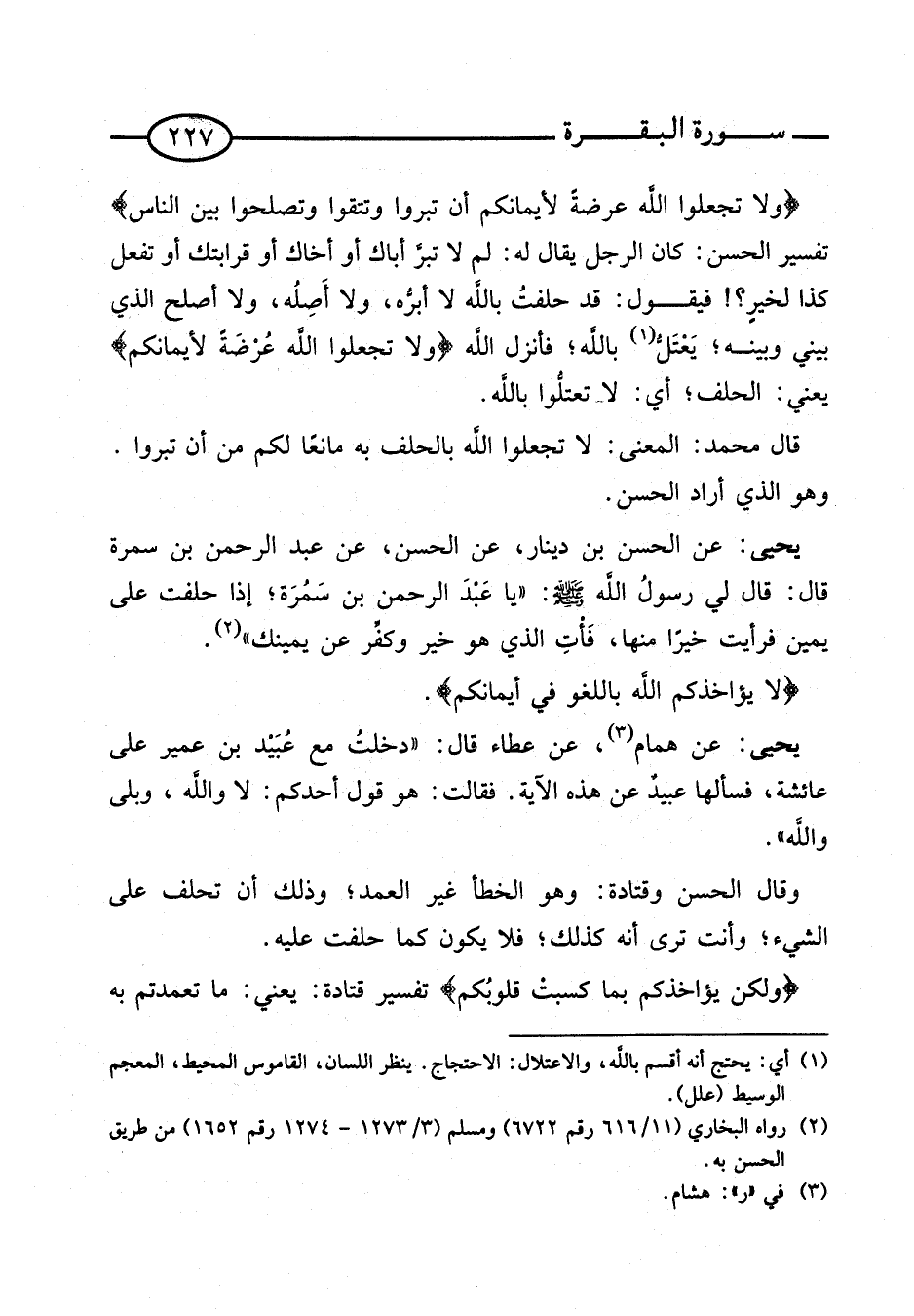{وَلا تَجْعَلُوا اللَّهَ عُرْضَةً لأَيْمَانِكُمْ أَنْ تَبَرُّوا وَتَتَّقُوا وَتُصْلِحُوا بَين النَّاس} تَفْسِير الحَسَن: كَانَ الرجل يُقَال لَهُ: لم لَا تبر أَبَاك أَو أَخَاك أَو قرابتك أَو تفعل كَذَا لخير؟! فَيَقُول: قد حَلَفت بِاللَّهِ لَا أبره، وَلا أَصله، وَلَا أصلح الَّذِي بيني وَبَينه؛ يعتل بِاللَّهِ؛ فَأنْزل اللَّه {وَلا تَجْعَلُوا اللَّهَ عُرْضَةً لأيمانكم} يَعْنِي: الْحلف؛ أَي: لَا تعتلوا بِاللَّهِ.