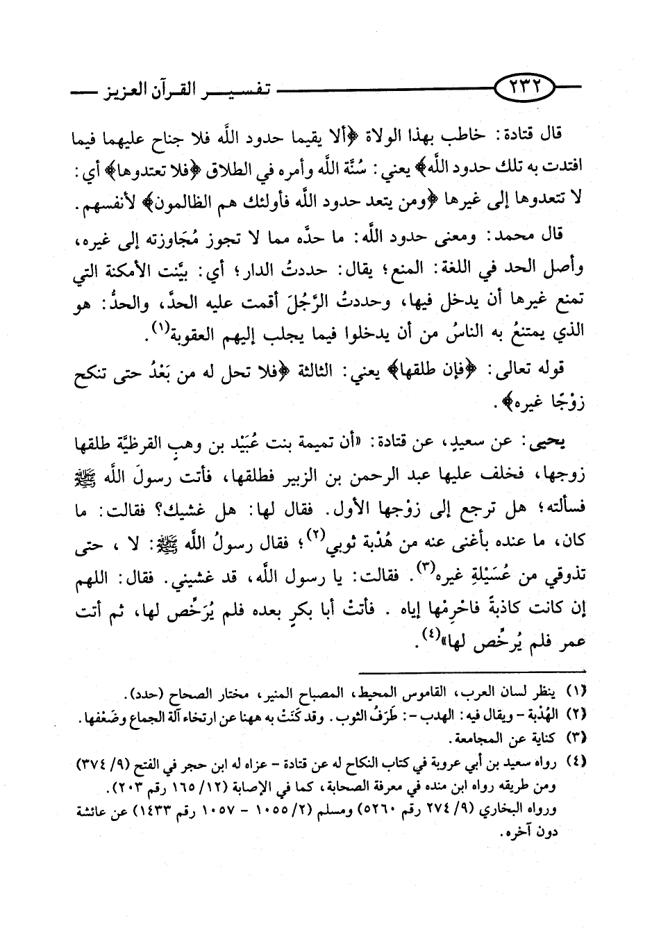 قَالَ قَتَادَة: خَاطب بِهَذَا الْوُلَاة {أَلَّا يُقِيمَا حُدُودَ اللَّهِ فَلا جُنَاحَ عَلَيْهِمَا فِيمَا افْتَدَتْ بِهِ تِلْكَ حُدُود الله} يَعْنِي: سنة اللَّه وَأمره فِي الطَّلَاق {فَلَا تعتدوها} أَي: لَا تتعدوها إِلَى غَيرهَا {وَمَنْ يَتَعَدَّ حُدُودَ اللَّهِ فَأُولَئِكَ هم الظَّالِمُونَ} لأَنْفُسِهِمْ.