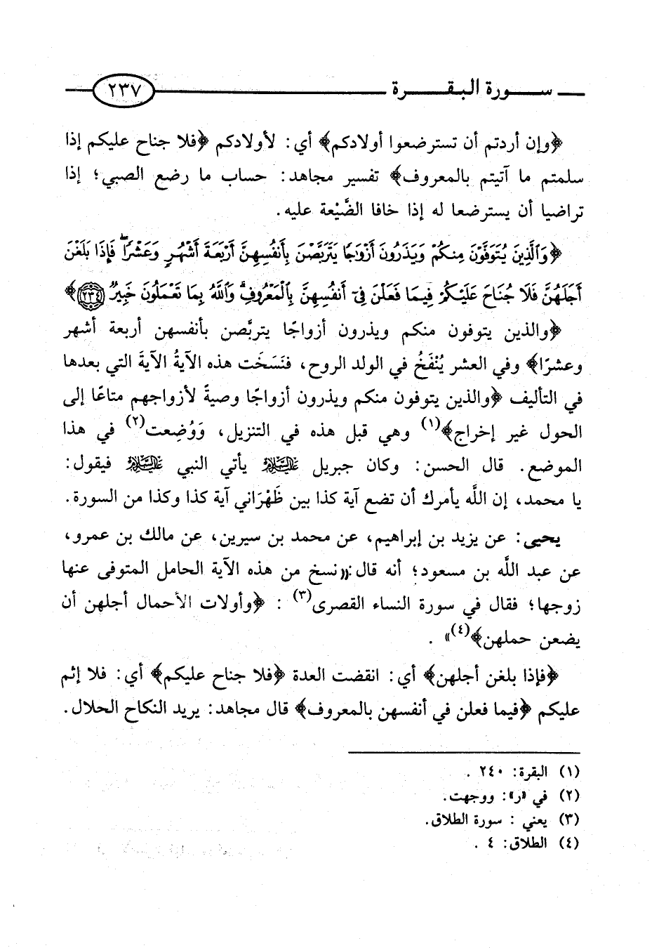 يَحْيَى: عَنْ يَزِيدَ بْنِ إِبْرَاهِيمَ، عَنْ مُحَمَّدِ بْنِ سِيرِينَ، عَنْ مَالِكِ بْنِ عَمْرٍو، عَنْ عَبْدِ اللَّهِ بْنِ مَسْعُودٍ؛ أَنَّهُ قَالَ: ((نُسِخَ مِنْ هَذِهِ الآيَةِ الْحَامِلُ الْمُتَوَفَّى عَنْهَا زَوْجُهَا؛ فَقَالَ فِي سُورَةِ النِّسَاءِ الْقُصْرَى: {وَأُولاتُ الأَحْمَالِ أَجَلُهُنَّ أَنْ يَضَعْنَ حَملهنَّ} (فَإِذا بلغن أَجلهنَّ} أَي: انْقَضتْ الْعدة {فَلا جُنَاحَ عَلَيْكُم} أَي: فَلَا إِثْم عَلَيْكُم {فِيمَا فعلن فِي أَنْفسهنَّ بِالْمَعْرُوفِ} قَالَ مُجَاهِد: يُرِيد النِّكَاح الْحَلَال.