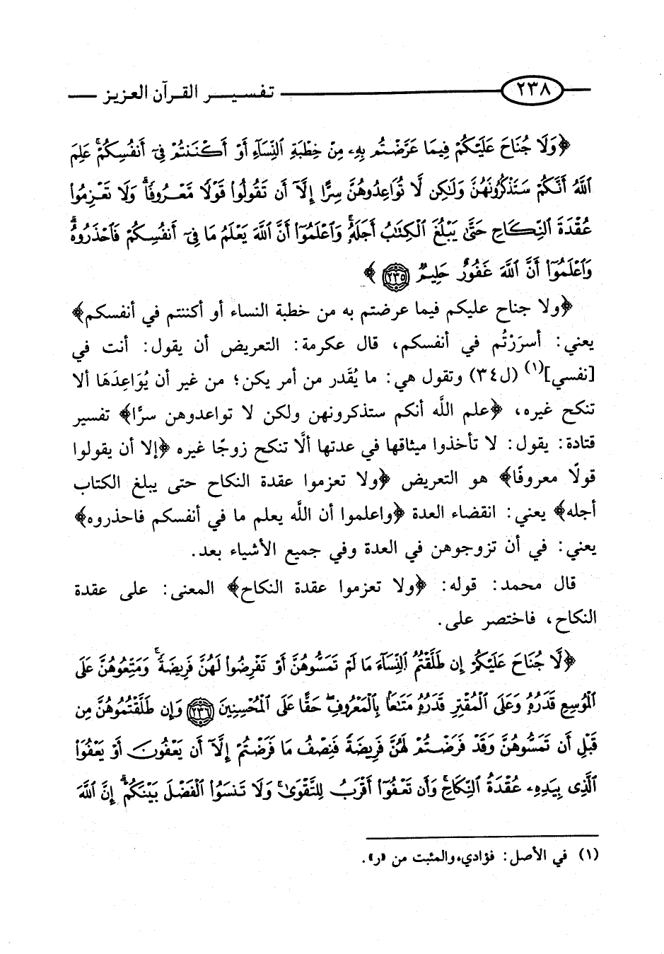 قَالَ مُحَمَّد: قَوْله: {وَلا تَعْزِمُوا عقدَة النِّكَاح} الْمَعْنى: عَلَى عقدَة النِّكَاح، فاختصر على. [آيَة 236]