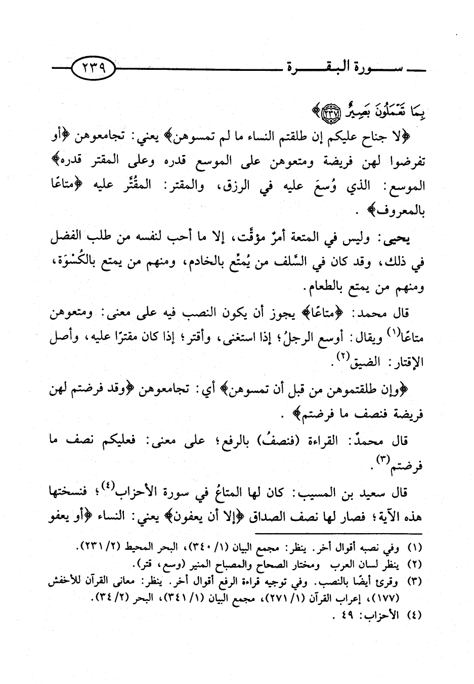 {لَا جُنَاحَ عَلَيْكُمْ إِنْ طَلَّقْتُمُ النِّسَاء مَا لم تمَسُّوهُنَّ} يَعْنِي: تجامعوهن {أَوْ تَفْرِضُوا لَهُنَّ فَرِيضَةً وَمَتِّعُوهُنَّ عَلَى الْمُوسِعِ قَدَرُهُ وعَلى المقتر قدره} الموسع: الَّذِي وُسع عَلَيْهِ فِي الرزق، والمقتر: المقتر عَلَيْهِ {مَتَاعًا بِالْمَعْرُوفِ}.