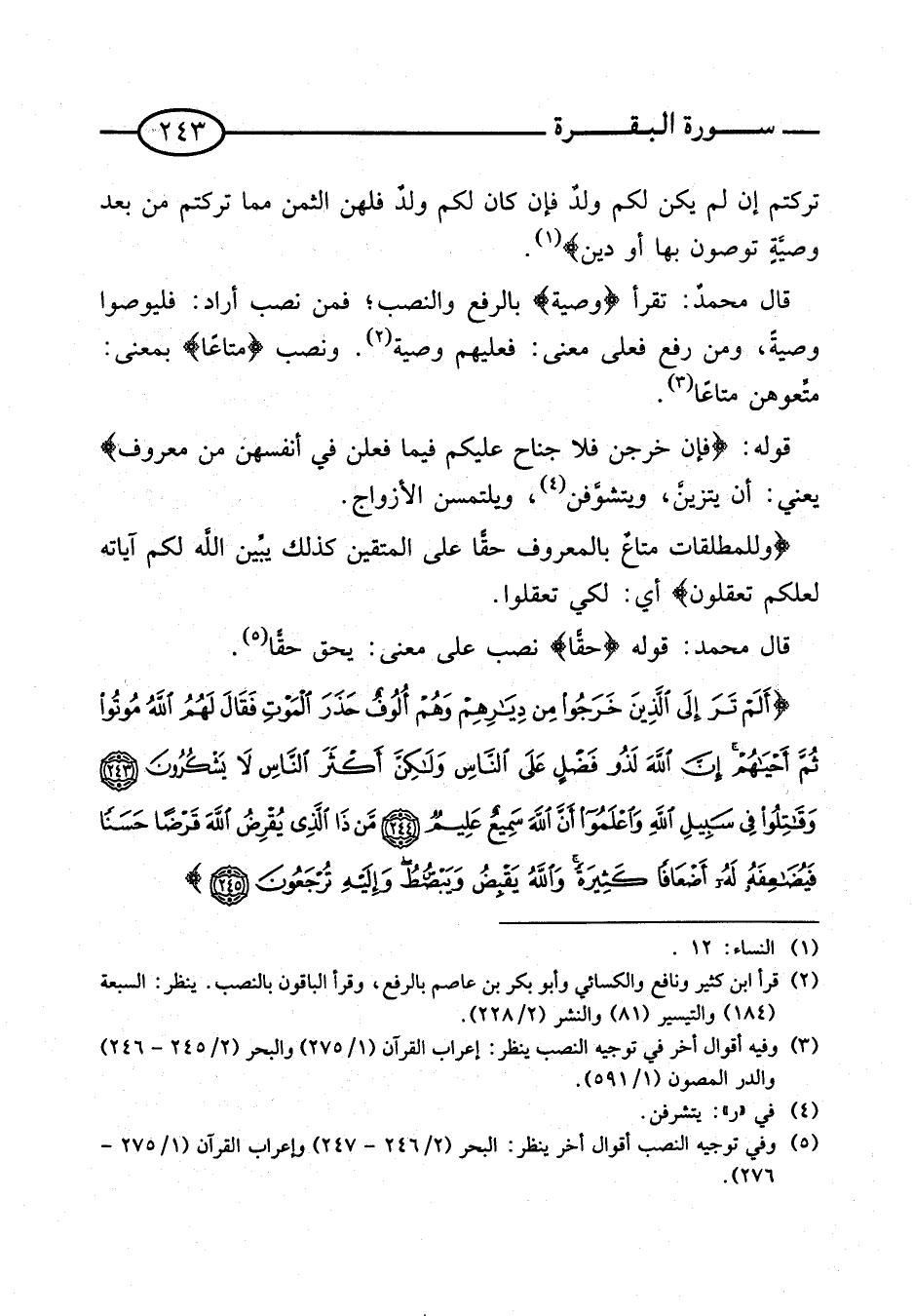 قَالَ مُحَمَّد: تقْرَأ {وَصِيَّة} بِالرَّفْع وَالنّصب؛ فَمن نصب أَرَادَ: فليوصوا وَصِيَّة، وَمن رفع فعلى معنى: فَعَلَيْهِم وَصِيَّة. وَنصب {مَتَاعًا} بِمَعْنى: متعوهن مَتَاعا.