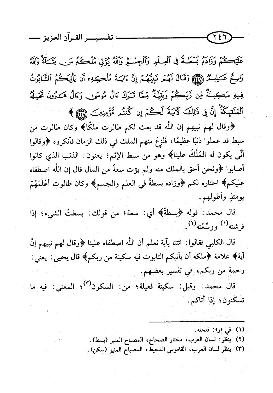 {وَقَالَ لَهُمْ نَبِيُّهُمْ إِنَّ اللَّهَ قَدْ بَعَثَ لَكُمْ طَالُوتَ مَلِكًا} وَكَانَ طالوت من سبط قد عمِلُوا ذَنبا عَظِيما، فَنُزِعَ مِنْهُم الْملك فِي ذَلِكَ الزَّمَان فأنكروه {وَقَالُوا أَنَّى يَكُونُ لَهُ الْمُلْكُ عَلَيْنَا} وَهُوَ من سبط الْإِثْم، يعنون: الذَّنب الَّذِي كَانُوا أَصَابُوا {وَنَحْنُ أَحَقُّ بِالْمُلْكِ مِنْهُ وَلَمْ يُؤْتَ سَعَةً مِنَ الْمَالِ قَالَ إِنَّ الله اصطفاه عَلَيْكُم} اخْتَارَهُ لكم {وَزَادَهُ بَسْطَةً فِي الْعلم والجسم} وَكَانَ طالوت أعلمهم يَوْمئِذٍ وأطولهم.