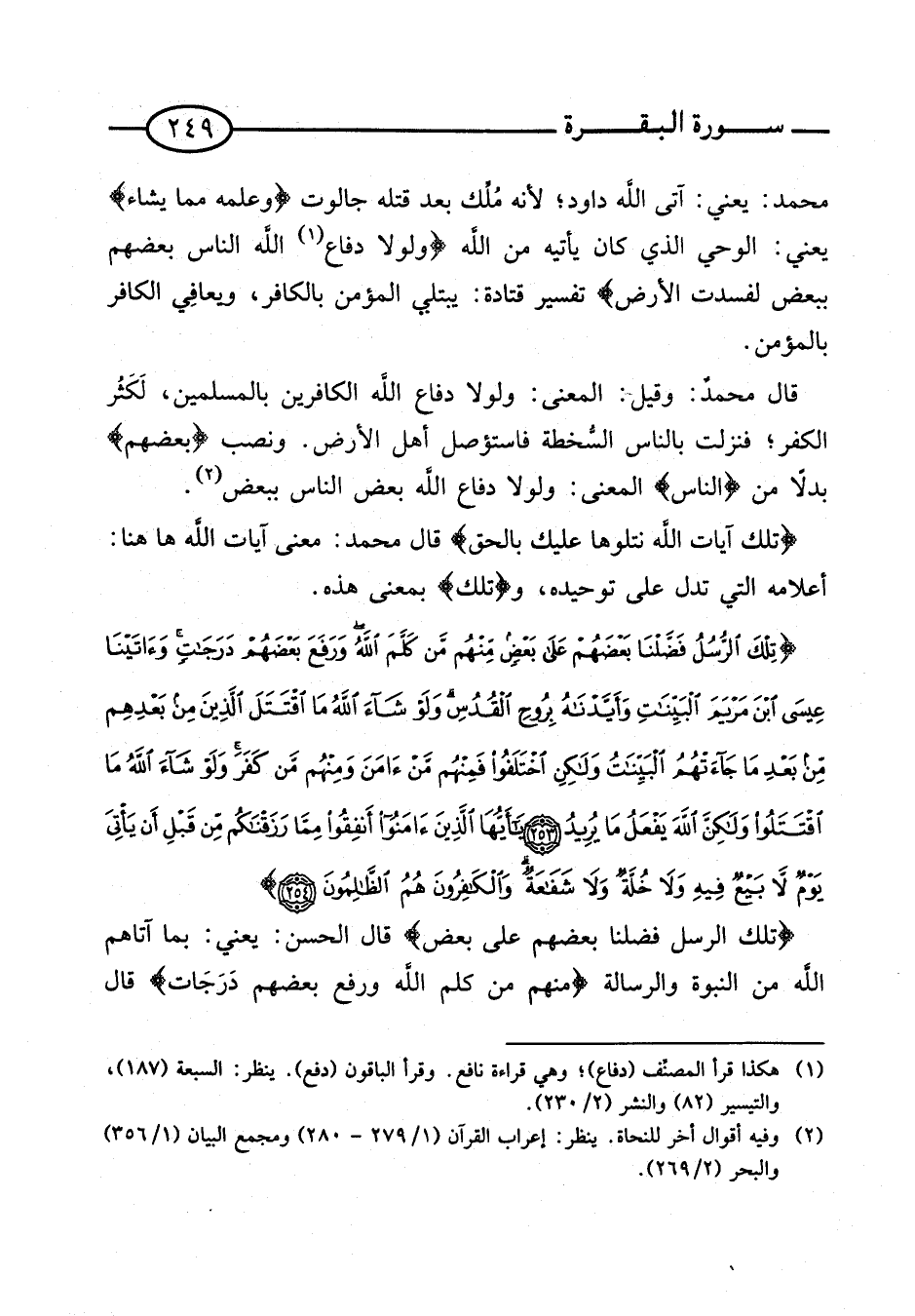 مُحَمَّد: يَعْنِي: آتى اللَّه دَاوُد؛ لِأَنَّهُ مُلِّكَ بعد قَتله جالوت {وَعلمه مِمَّا يَشَاء} يَعْنِي: الْوَحْي الَّذِي كَانَ يَأْتِيهِ من اللَّه {وَلَوْلا دِفْاعُ اللَّهِ النَّاسَ بَعْضَهُمْ بِبَعْضٍ لَفَسَدَتِ الأَرْضُ} تَفْسِير قَتَادَة: يبتلى الْمُؤْمن بالكافر، وَيُعَافى الْكَافِر بِالْمُؤمنِ.