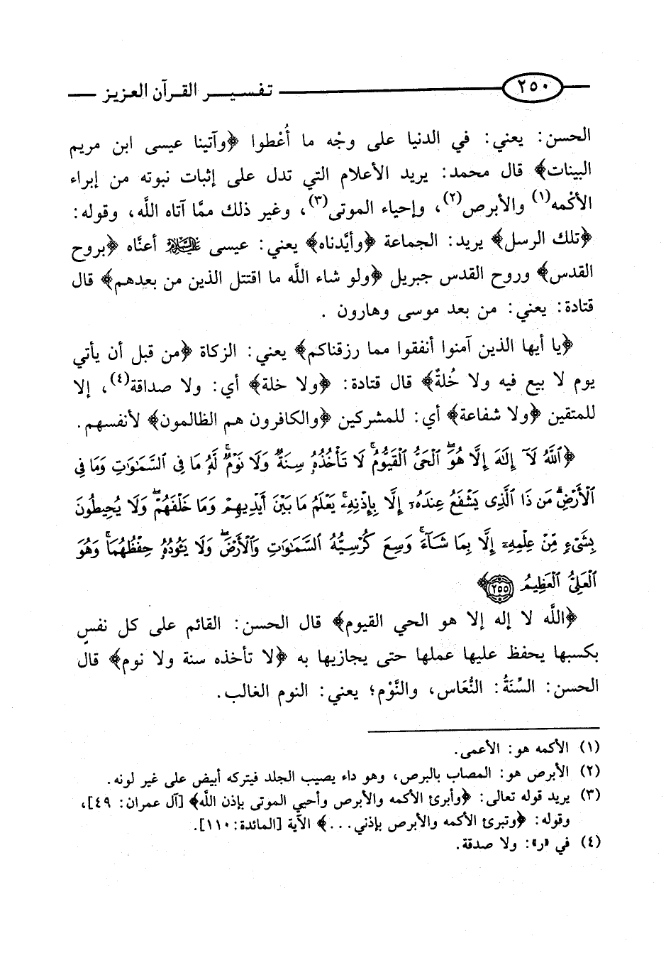 {اللَّهُ لَا إِلَهَ إِلا هُوَ الْحَيّ القيوم} قَالَ الحَسَن: الْقَائِم عَلَى كُلِّ نفس بكسبها يحفظ عَلَيْهَا عَملهَا حَتَّى يجازيها بِهِ {لَا تَأْخُذُهُ سنة وَلَا نوم} قَالَ الحَسَن: السّنة: النعاس، وَالنَّوْم؛ يَعْنِي: النّوم الْغَالِب.