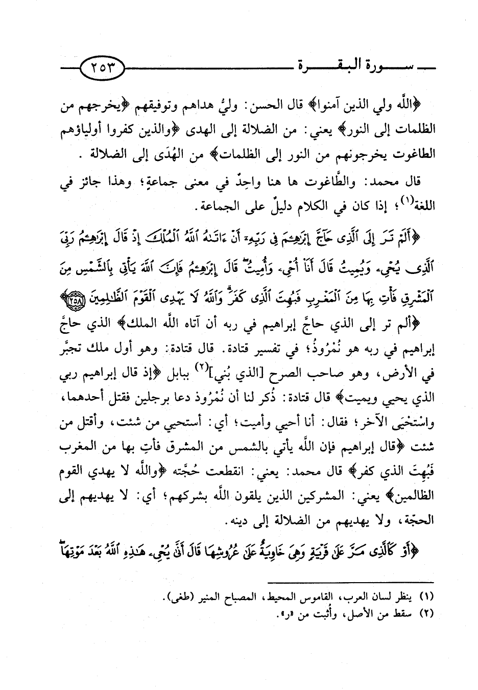 {أَلَمْ تَرَ إِلَى الَّذِي حَاجَّ إِبْرَاهِيمَ فِي رَبِّهِ أَنْ آتَاهُ الله الْملك} الَّذِي حَاجَّ إِبْرَاهِيمَ فِي رَبِّهِ هُوَ نمروذ؛ فِي تَفْسِير قَتَادَة. قَالَ قَتَادَة: وَهُوَ أول ملك تجبر فِي الأَرْض، وَهُوَ صَاحب الصرح [الَّذِي بني] بِبَابِل {إِذْ قَالَ إِبْرَاهِيمُ رَبِّيَ الَّذِي يُحْيِي وَيُمِيت} قَالَ قَتَادَة: ذكر لنا أَن نمروذ دَعَا برجلَيْن فَقتل أَحدهمَا، واستحيى الآخر؛ فَقَالَ: أَنَا أحيي وأميت؛ أَي: أستحيي من شِئْت، وأقتل من شِئْت {قَالَ إِبْرَاهِيمُ فَإِنَّ اللَّهَ يَأْتِي بِالشَّمْسِ مِنَ الْمَشْرِقِ فَأْتِ بِهَا مِنَ الْمَغْرِبِ فبهت الَّذِي كفر} قَالَ مُحَمَّد: يَعْنِي: انْقَطَعت حجَّته {وَاللَّهُ لَا يَهْدِي الْقَوْمَ الظَّالِمِينَ} يَعْنِي: الْمُشْركين الَّذين يلقون اللَّه بشركهم، أَي: لَا يهْدِيهم إِلَى الْحجَّة، وَلا يهْدِيهم من الضَّلَالَة إِلَى دينه. [آيَة]