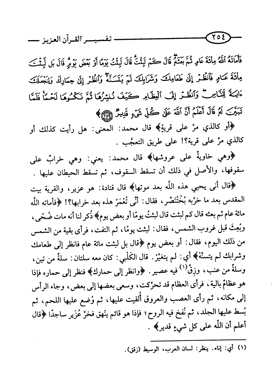 {أَوْ كَالَّذِي مَرَّ عَلَى قَرْيَةٍ} قَالَ مُحَمَّد: الْمَعْنى: هَلْ رَأَيْت كَذَلِك أَو كَالَّذي مر عَلَى قَرْيَة؟ {عَلَى طَرِيق التَّعَجُّب. {وَهِيَ خاوية على عروشها} قَالَ مُحَمَّد: يَعْنِي: وَهِي خراب على سقوفها، وَالْأَصْل فِي ذَلِكَ أَن تسْقط السقوف، ثمَّ تسْقط الْحِيطَان عَلَيْهَا. {قَالَ أَنَّى يُحْيِي هَذِه الله بعد مَوتهَا} قَالَ قَتَادَة: هُوَ عَزِيز، والقرية بَيت الْمُقَدّس بعد مَا خربه بخْتنصر، فَقَالَ: أَنى تُعْمَرُ هَذِه بعد خرابها؟} {فَأَمَاتَهُ اللَّهُ مِائَةَ عَامٍ ثُمَّ بَعَثَهُ قَالَ كَمْ لَبِثْتَ قَالَ لَبِثْتُ يَوْمًا أَو بعض يَوْم} ذكر لَنَا أَنَّهُ مَاتَ ضحى، وَبعث قبل غرُوب الشَّمْس، فَقَالَ: لَبِثت يَوْمًا، ثمَّ الْتفت، فَرَأى بَقِيَّة من الشَّمْس من ذَلِكَ الْيَوْم، فَقَالَ: أَو بَعْض يَوْم {قَالَ بَلْ لَبِثْتَ مِائَةَ عَامٍ فَانْظُرْ إِلَى طَعَامِكَ وَشَرَابِكَ لَمْ يتسنه} أَي: لم يتَغَيَّر. قَالَ الْكَلْبِيّ: كَانَ مَعَه سلتان: سلة من تين، وسلة من عِنَب، وزِقٌّ فِيهِ عصير. {وَانْظُرْ إِلَى حِمَارِكَ} فَنظر إِلَى حِمَاره فَإِذا هوعظام بالية، فَرَأى الْعِظَام قد تحركت، وسعى بَعْضهَا إِلَى بَعْض، وَجَاء الرَّأْس إِلَى مَكَانَهُ، ثمَّ رَأَى العصب وَالْعُرُوق ألقيت عَلَيْهَا، ثمَّ وُضعَ عَلَيْهَا اللَّحْم، ثمَّ بسط عَلَيْهَا الْجلد، ثمَّ نفخ فِيهِ الرّوح؛ فَإِذا هُوَ قَائِم ينهق فَخر عُزَيْر سَاجِدا {قَالَ أَعْلَمُ أَنَّ اللَّهَ عَلَى كُلِّ شَيْءٍ قدير}.