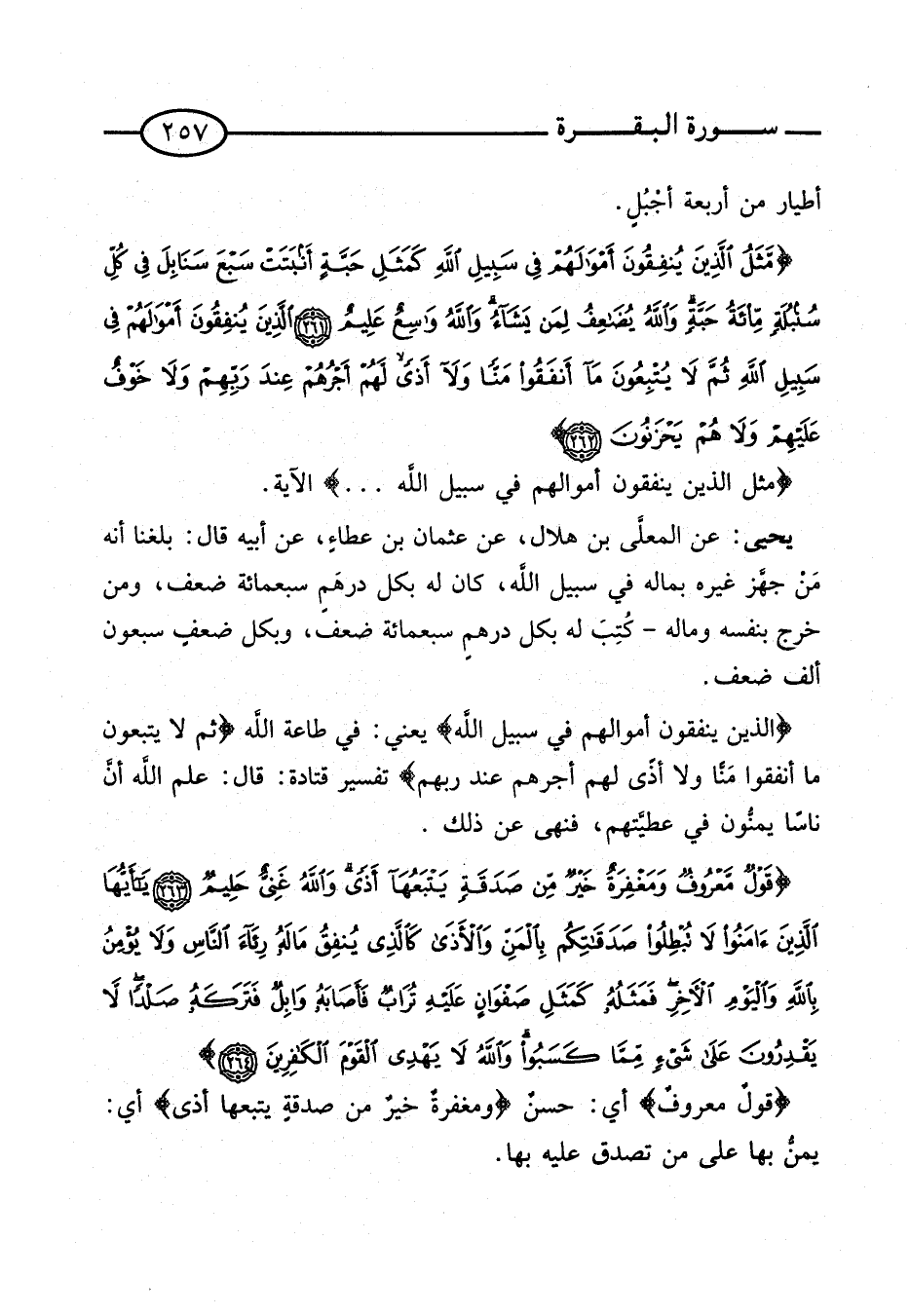 {الَّذِينَ يُنْفِقُونَ أَمْوَالَهُمْ فِي سَبِيلِ الله} يَعْنِي: فِي طَاعَة اللَّه {ثُمَّ لَا يُتْبِعُونَ مَا أَنْفَقُوا مَنًّا وَلا أَذًى لَهُمْ أَجْرُهُمْ عِنْدَ رَبهم} تَفْسِير قَتَادَة: قَالَ: علم اللَّه أَن نَاسا يمنون فِي عطيتهم، فَنهى عَن ذَلِك. [آيَة 263 - 264]