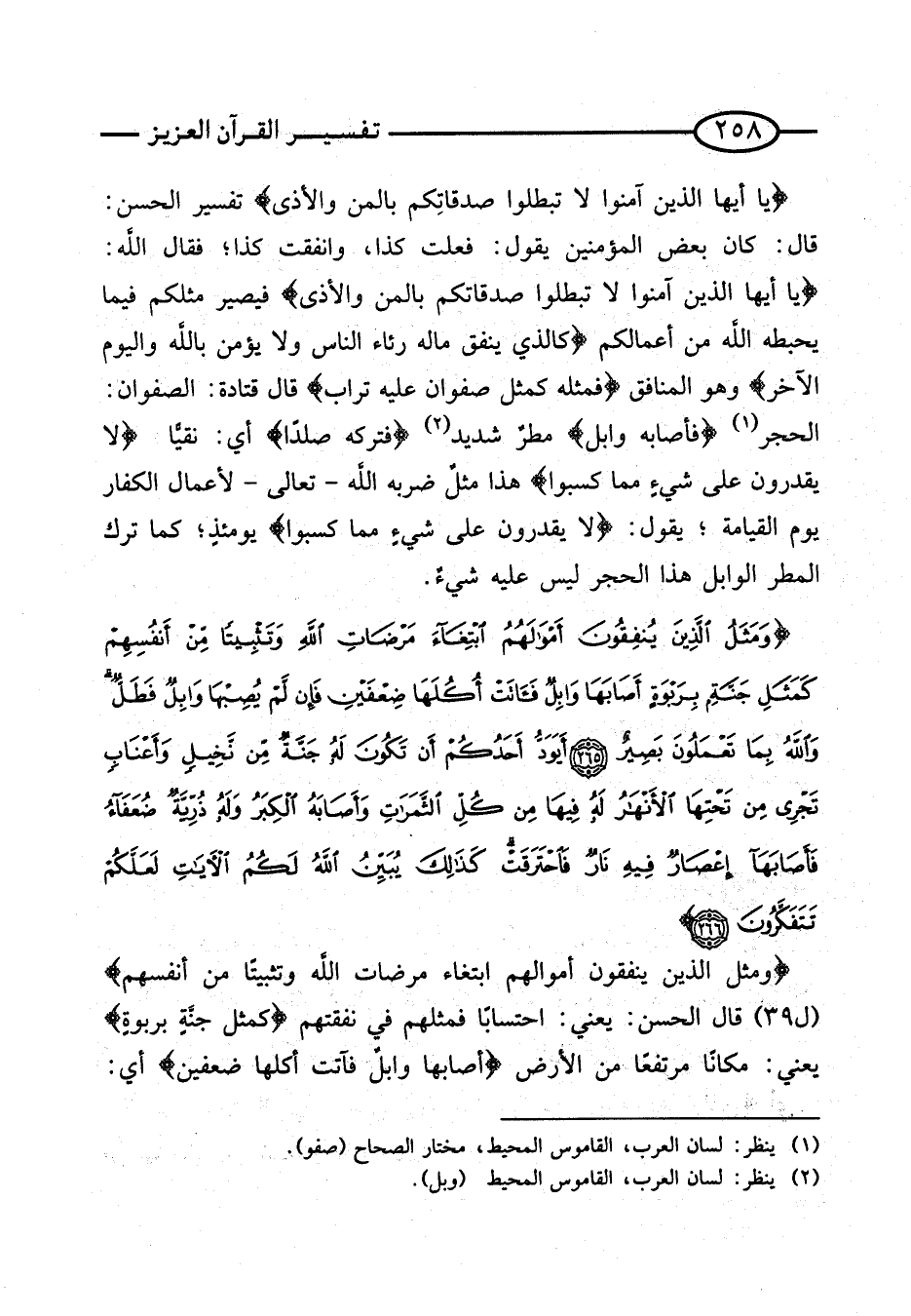 {يَا أَيهَا الَّذِينَ آمَنُوا لَا تُبْطِلُوا صَدَقَاتِكُمْ بالمن والأذى} تَفْسِير الحَسَن: قَالَ: كَانَ بَعْض الْمُؤمنِينَ يَقُولُ: فعلت كَذَا، وأنفقت كَذَا؛ فَقَالَ الله: {يَا أَيهَا الَّذِينَ آمَنُوا لَا تُبْطِلُوا صَدَقَاتِكُمْ بالمن والأذى} فَيصير مثلكُمْ فِيمَا يحبطه اللَّه من أَعمالكُم {كَالَّذِي يُنْفِقُ مَالَهُ رِئَاءَ النَّاسِ وَلا يُؤْمِنُ بِاللَّهِ وَالْيَوْم الآخر} وَهُوَ الْمُنَافِق {فَمَثَلُهُ كَمَثَلِ صَفْوَانٍ عَلَيْهِ تُرَاب} قَالَ قَتَادَة: الصفوان: الْحجر {فَأَصَابَهُ وابل} مطر شَدِيد {فَتَركه صَلدًا} أَي: نقيا {لَا يَقْدِرُونَ عَلَى شَيْء مِمَّا كسبوا} هَذَا مثل ضربه الله - تَعَالَى - لأعمال الْكفَّار يَوْم الْقِيَامَة؛ يَقُول: {لَا يَقْدِرُونَ عَلَى شَيْءٍ مِمَّا كسبوا} يَوْمئِذٍ؛ كَمَا ترك الْمَطَر الوابل هَذَا الْحجر لَيْسَ عَلَيْهِ شَيْء. [آيَة 265 - 266]