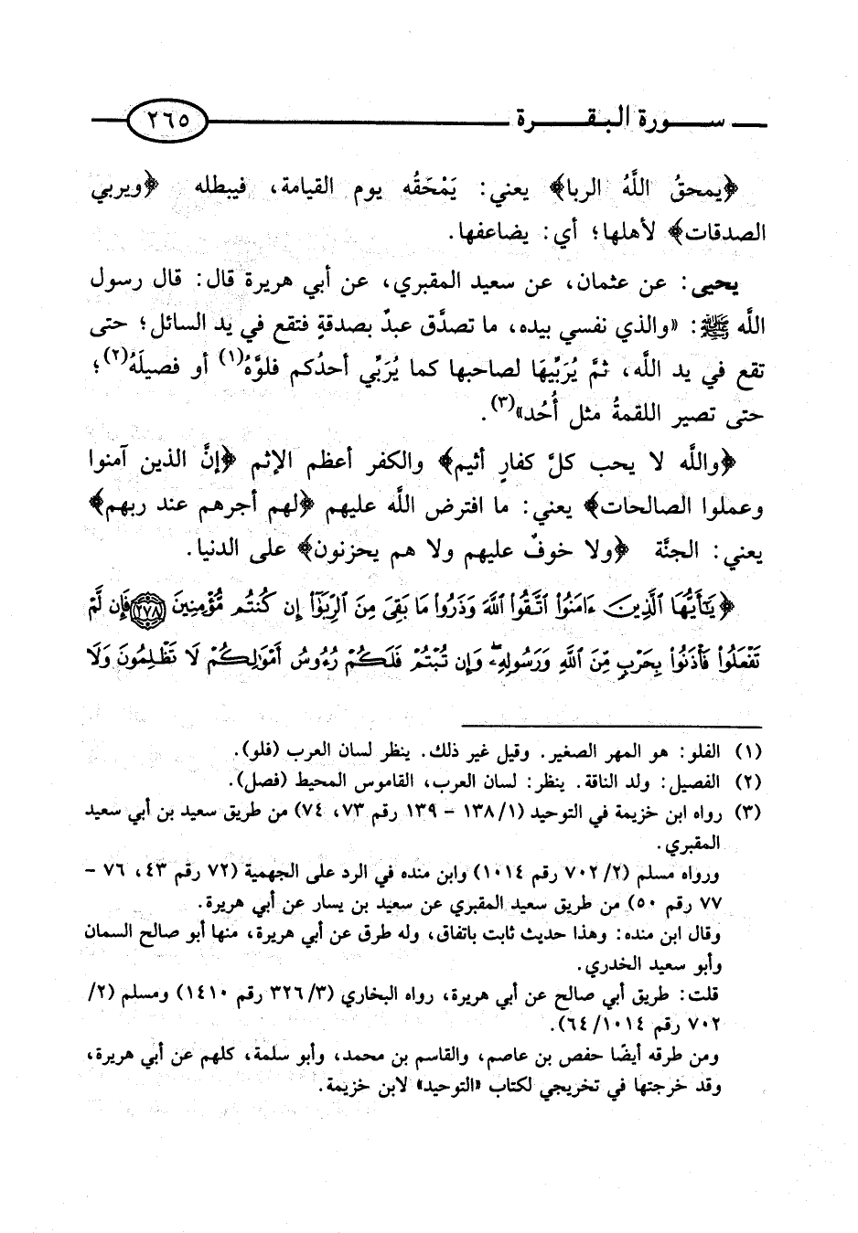 يَحْيَى: عَنْ عُثْمَانَ، عَنْ سَعِيدٍ الْمَقْبُرِيِّ، عَنْ أَبِي هُرَيْرَةَ قَالَ: قَالَ رَسُولُ اللَّهِ صَلَّى اللَّهُ عَلَيْهِ وَسَلَّمَ: ((وَالَّذِي نَفْسِي بِيَدِهِ، مَا تَصَدَّقَ عَبْدٌ بِصَدَقَةٍ فَتَقَعُ فِي يَدِ السَّائِلِ؛ حَتَّى تَقَعَ فِي يَدِ اللَّهِ، ثُمَّ يُرَبِّيهَا لِصَاحِبِهَا كَمَا يُرَبِّي أَحَدُكُمْ فُلُوَّهُ أَوْ فَصِيلَهُ؛ حَتَّى تَصِيرَ اللُّقْمَةُ مِثْلَ أُحُدٍ)). {وَاللَّهُ لَا يُحِبُّ كُلَّ كَفَّارٍ أثيم} وَالْكفْر أعظم الْإِثْم