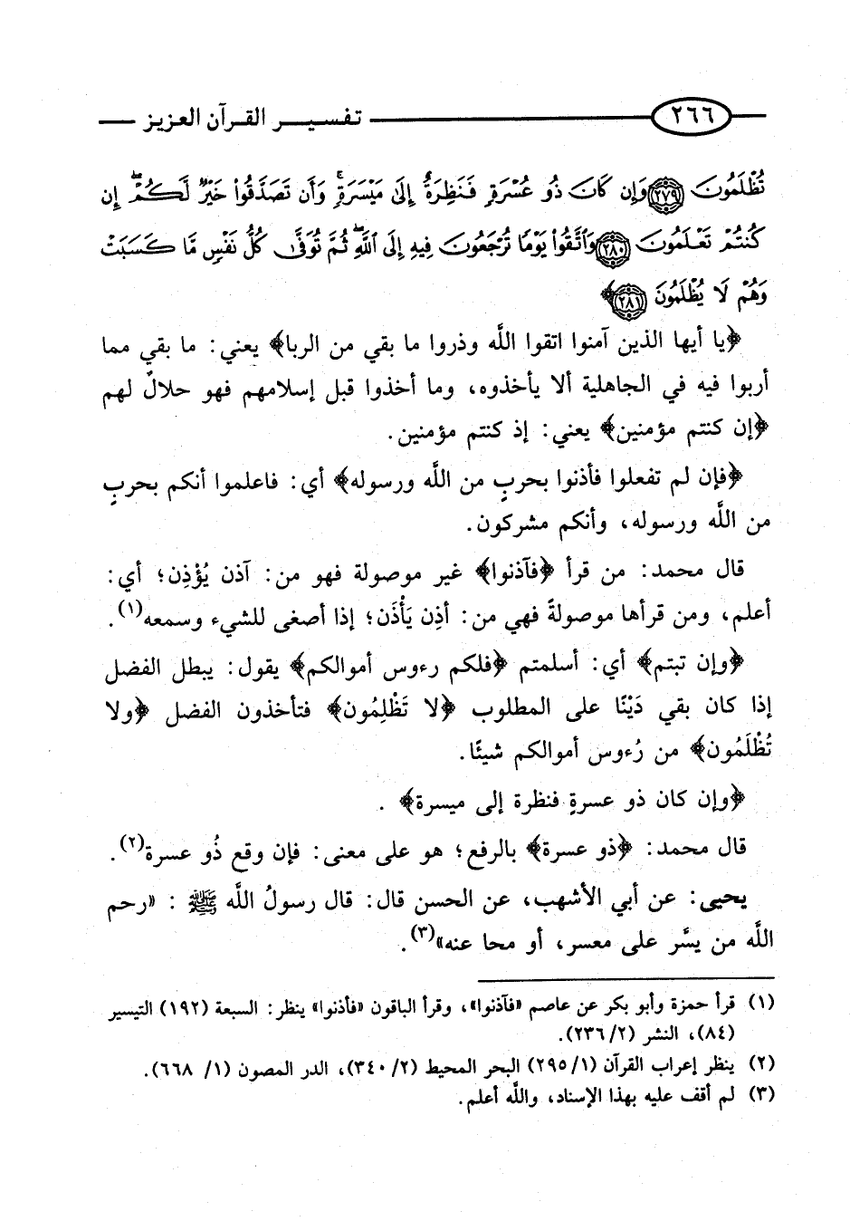 قَالَ مُحَمَّد: من قَرَأَ {فَآذِنُوا} غير مَوْصُولَة فَهُوَ من: آذن يُؤذن؛ أَي: أعلم، وَمن قَرَأَهَا مَوْصُولَة فَهِيَ من: أذن يَأْذَن؛ إِذا أصغى للشَّيْء وسَمعه. {وَإِنْ تُبْتُمْ} أَي: أسلمتم {فَلَكُمْ رُءُوسُ أَمْوَالِكُمْ} يَقُولُ: يبطل الفَضْل إِذا كَانَ بَقِي دينا عَلَى الْمَطْلُوب {لَا تظْلمُونَ} فتأخذون الْفضل {وَلَا تظْلمُونَ} من رُءُوس أَمْوَالكُم شَيْئا.