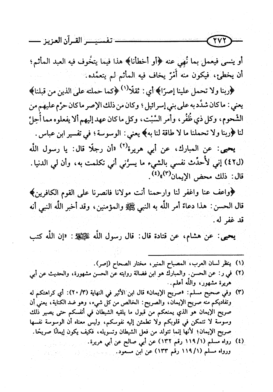 يَحْيَى: عَنِ الْمُبَارَكِ، عَنْ أبي هُرَيْرَة ((أَن رجلا قَالَ: يَا رَسُول الله (ل 42) إِنِّي لأُحَدِّثُ نَفْسِي بِالشَّيْءِ مَا يَسُرُّنِي أَنِّي تَكَلَّمْتُ بِهِ، وَأَنَّ لِيَ الدُّنْيَا. قَالَ: ذَلِكَ مَحْضُ الإِيمَانِ)). {وَاعْفُ عَنَّا وَاغْفِرْ لَنَا وَارْحَمْنَا أَنْتَ مَوْلانَا فَانْصُرْنَا عَلَى الْقَوْم الْكَافرين} قَالَ الْحسن: هَذَا دُعَاء أَمر اللَّه بِهِ النَّبي صَلَّى اللَّهُ عَلَيْهِ وَسَلَّمَ وَالْمُؤمنِينَ، وَقد أخبر الله النَّبِي أَنَّهُ قد غفر لَهُ.