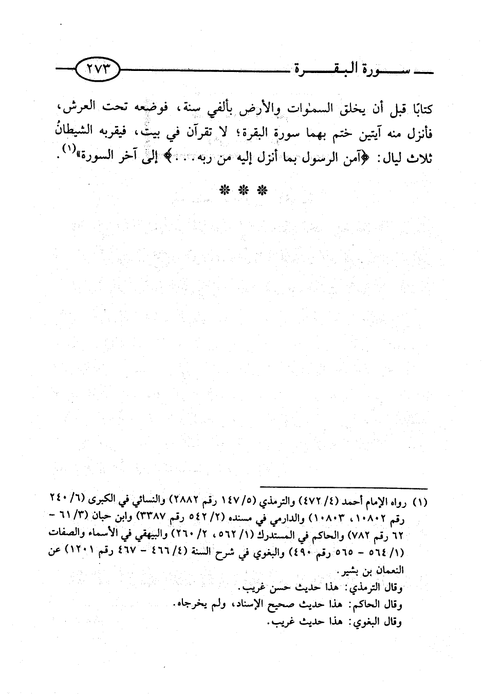 كِتَابًا قَبْلَ أَنْ يَخْلُقَ السَّمَوَاتِ وَالأَرْضَ بِأَلْفَيْ سَنَةٍ، فَوَضَعَهُ تَحْتَ الْعَرْش، فَأنْزل مِنْهُ آيَتَيْنِ خَتَمَ بِهِمَا سُورَةَ الْبَقَرَةِ؛ لَا تُقْرَآنِ فِي بَيْتٍ، فَيَقْرَبُهُ الشَّيْطَانُ ثَلاثَ لَيَالٍ: {آمَنَ الرَّسُولُ بِمَا أُنْزِلَ إِلَيْهِ مِنْ ربه} إِلَى آخِرِ السُّورَةِ)).