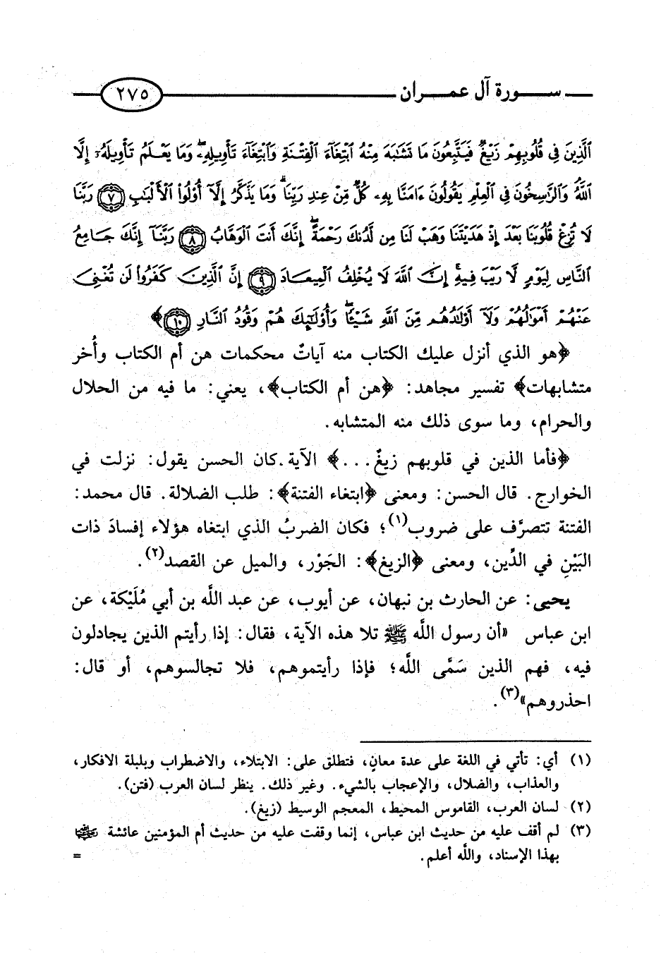 {هُوَ الَّذِي أَنْزَلَ عَلَيْكَ الْكِتَابَ مِنْهُ آيَاتٌ مُحْكَمَاتٌ هُنَّ أُمُّ الْكتاب وَأخر متشابهات} تَفْسِير مُجَاهِد: {هُنَّ أُمُّ الْكِتَابِ}، يَعْنِي: مَا فِيهِ من الْحَلَال وَالْحرَام، وَمَا سوى ذَلِك مِنْهُ الْمُتَشَابه. {فَأَمَّا الَّذِينَ فِي قُلُوبِهِمْ زيغ} الْآيَة. كَانَ الحَسَن يَقُولُ: نزلت فِي الْخَوَارِج. قَالَ الحَسَن: وَمعنى {ابْتِغَاء الْفِتْنَة}: طلب الضَّلَالَة. قَالَ مُحَمَّد: الْفِتْنَة تتصرف عَلَى ضروب؛ فَكَانَ الضَّرْب الَّذِي ابتغاه هَؤُلاءِ إِفْسَاد ذَات الْبَين فِي الدِّين، وَمعنى {الزيغ}: الْجور، والميل عَنِ الْقَصْد.