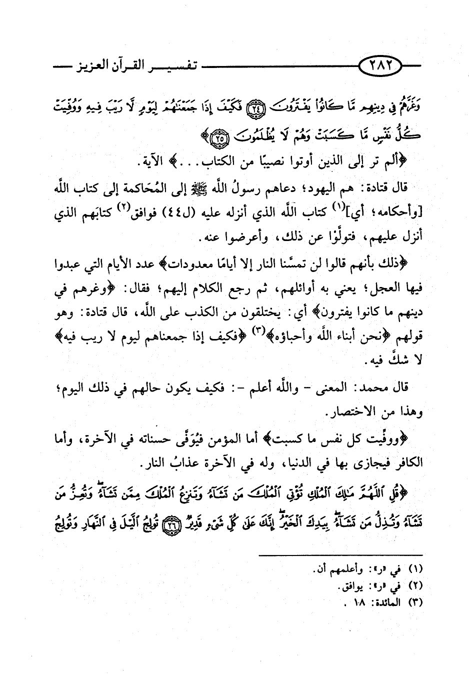 {أَلَمْ تَرَ إِلَى الَّذِينَ أُوتُوا نَصِيبا من الْكتاب} الْآيَة. \ قَالَ قَتَادَة: هُم الْيَهُود؛ دعاهم رَسُول اللَّهِ صَلَّى اللَّهُ عَلَيْهِ وَسَلَّمَ إِلَى المحاكمة إِلَى كتاب اللَّه [وَأَحْكَامه؛ أَي] كتاب الله الَّذِي أنزلهُ عَلَيْهِ (ل 44) فَوَافَقَ كِتَابهمْ الَّذِي أنزل عَلَيْهِم، فتولوا عَنْ ذَلِكَ، وأعرضوا عَنْهُ.