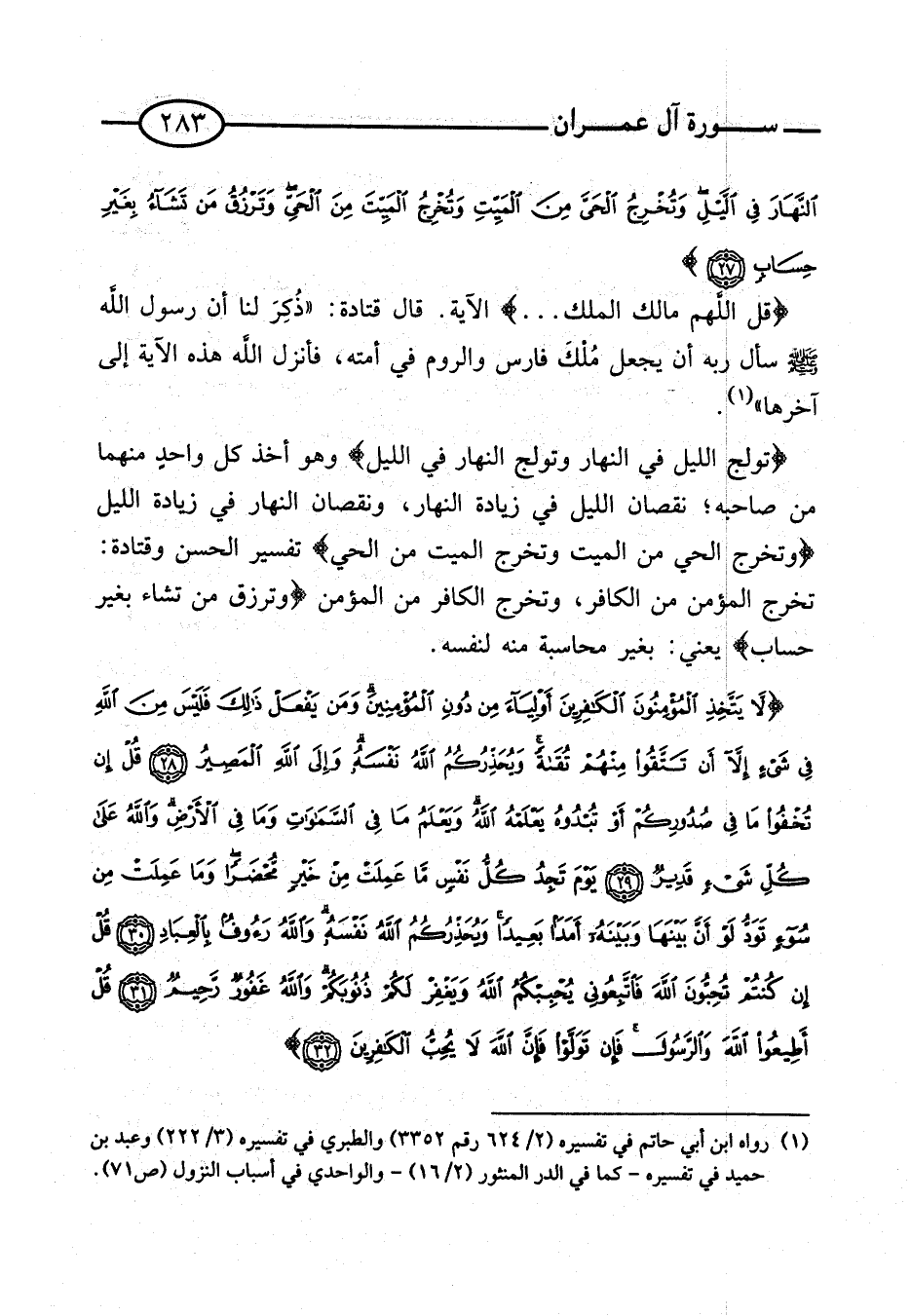 {تُولِجُ اللَّيْلَ فِي النَّهَارِ وَتُولِجُ النَّهَار فِي اللَّيْل} وَهُوَ أَخذ كل وَاحِد مِنْهُمَا من صَاحبه؛ نُقْصَان اللَّيْل فِي زِيَادَة النَّهَار، ونقصان النَّهَار فِي زِيَادَة اللَّيْل {وَتُخْرِجُ الْحَيَّ مِنَ الْمَيِّتِ وَتُخْرِجُ الْمَيِّتَ مِنَ الْحَيِّ} تَفْسِير الحَسَن وَقَتَادَة: تخرج المُؤْمن من الْكَافِر، وَتخرج الْكَافِر من الْمُؤمن {وَتَرْزُقُ مَنْ تَشَاءُ بِغَيْرِ حِسَاب} يَعْنِي: بِغَيْر محاسبة مِنْهُ لنَفسِهِ. [آيَة 28 - 32]