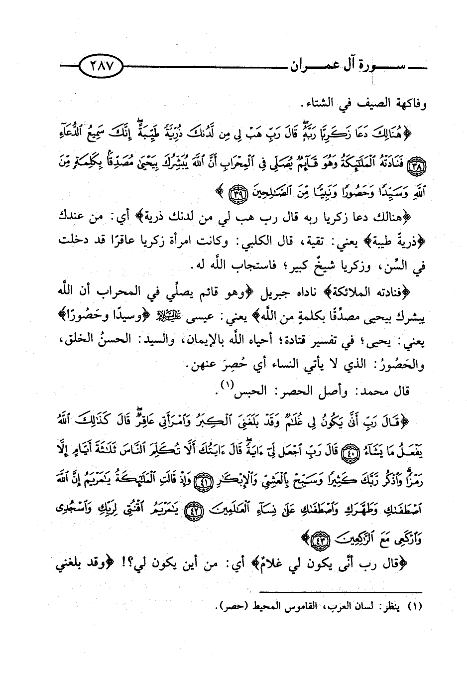 {فنادته الْمَلَائِكَة} ناداه جِبْرِيل {وَهُوَ قَائِمٌ يُصَلِّي فِي الْمِحْرَابِ أَنَّ اللَّهَ يُبَشِّرُكَ بِيَحْيَى مُصَدِّقًا بِكَلِمَةٍ مِنَ اللَّهِ} يَعْنِي: عِيسَى عَلَيْهِ السَّلام {وَسَيِّدًا وَحَصُورًا} يَعْنِي: يحيى؛ فِي تَفْسِير قَتَادَة؛ أَحْيَاهُ اللَّه بِالْإِيمَان، وَالسَّيِّد: الحَسَن الْخلق، والحصور: الَّذِي لَا يَأْتِي النِّسَاء أَي حصر عَنْهُن.