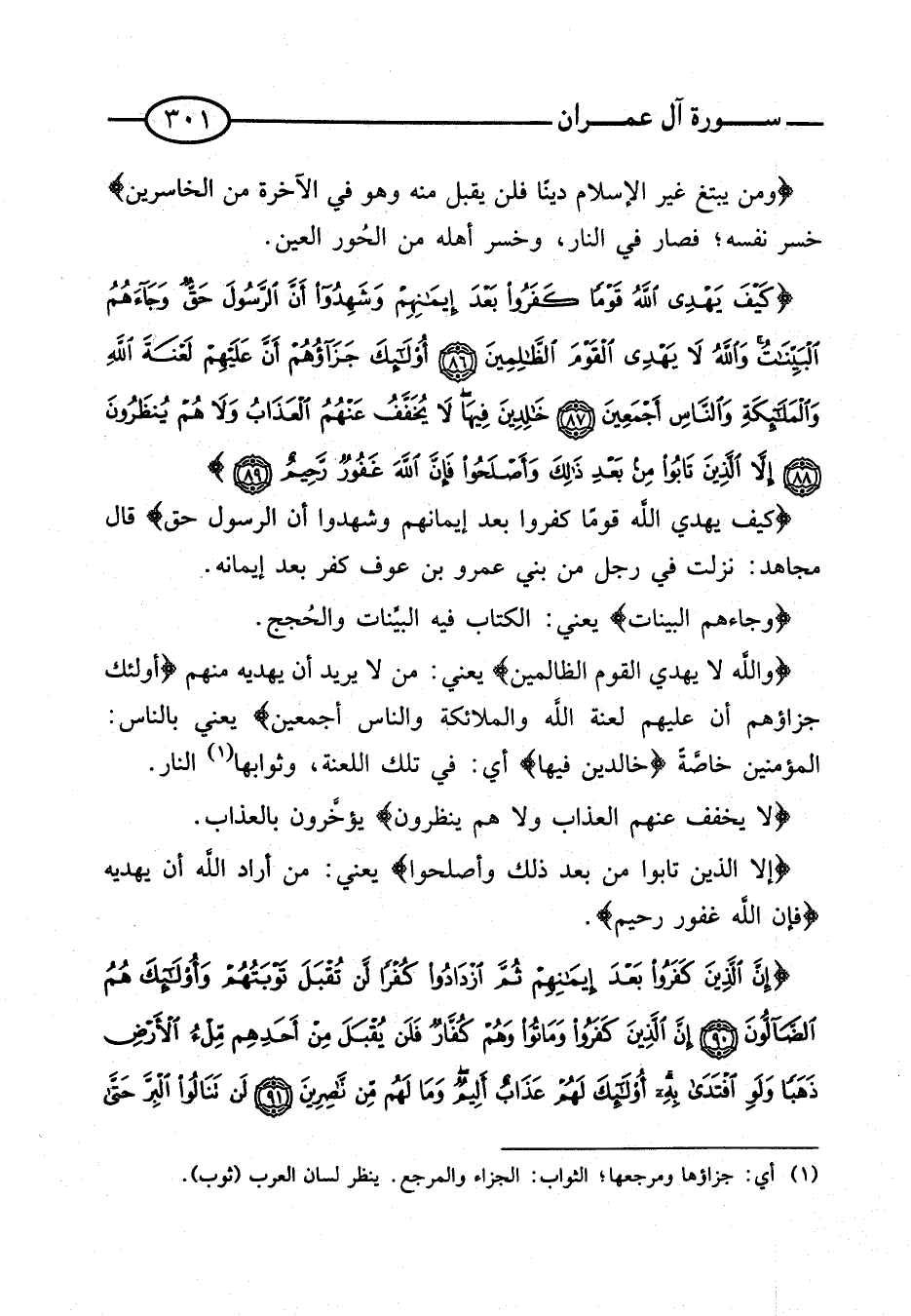 {وَمَنْ يَبْتَغِ غَيْرَ الإِسْلامِ دِينًا فَلَنْ يُقْبَلَ مِنْهُ وَهُوَ فِي الْآخِرَة من الخاسرين} خسر نَفسه؛ فَصَارَ فِي النَّار، وخسر أَهله من الْحور الْعين. [آيَة 86 - 89]